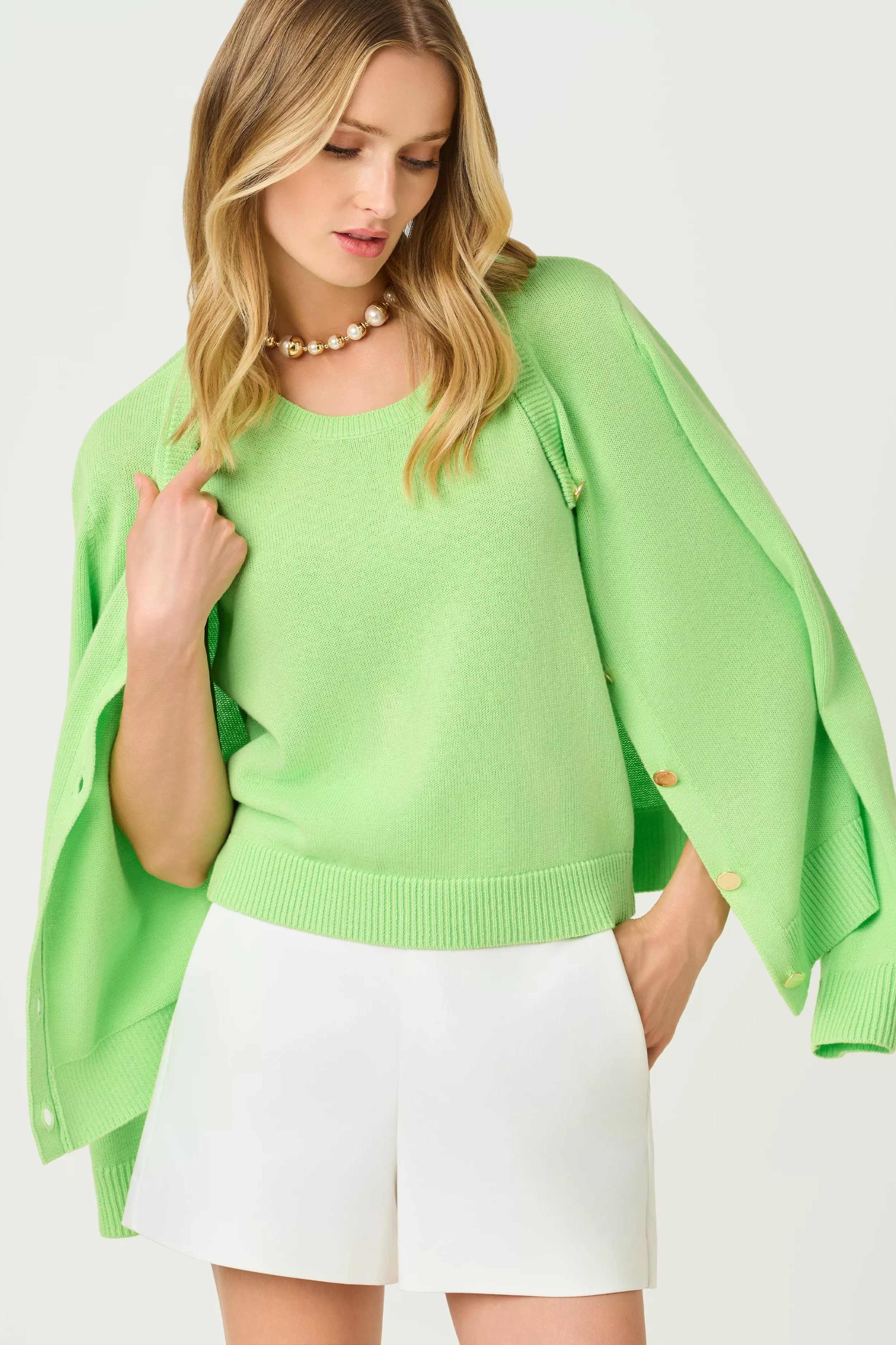 The Amalia Cardigan is a classic button-front knit cardigan with a crew neckline and long sleeves. This lightweight, ribbed-hem sweater features gold-tone buttons for a polished touch. It pairs easily with work separates or casual weekend looks. Designed by Lilly Pulitzer, it offers a fresh, bright colorway for seasonal layering.