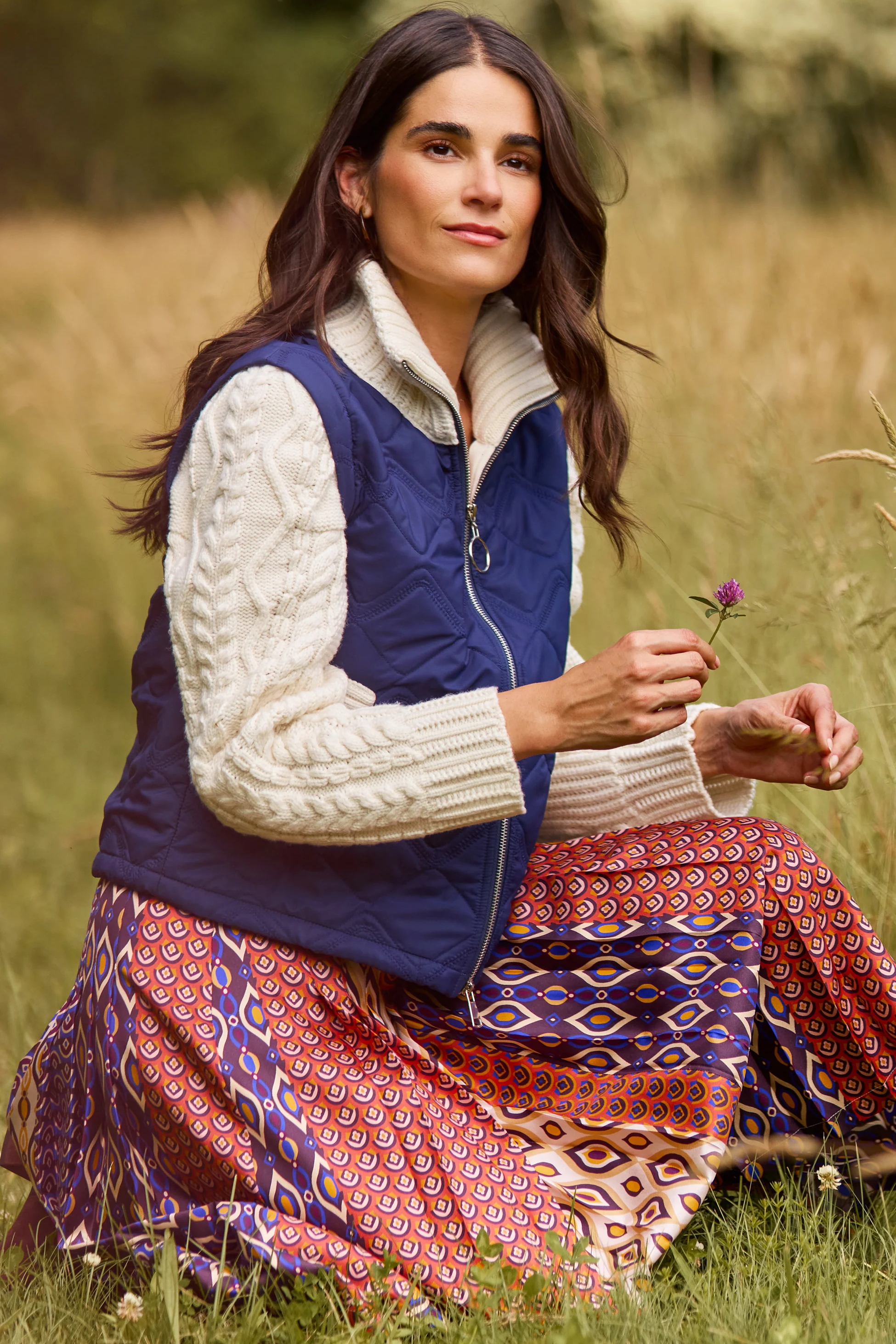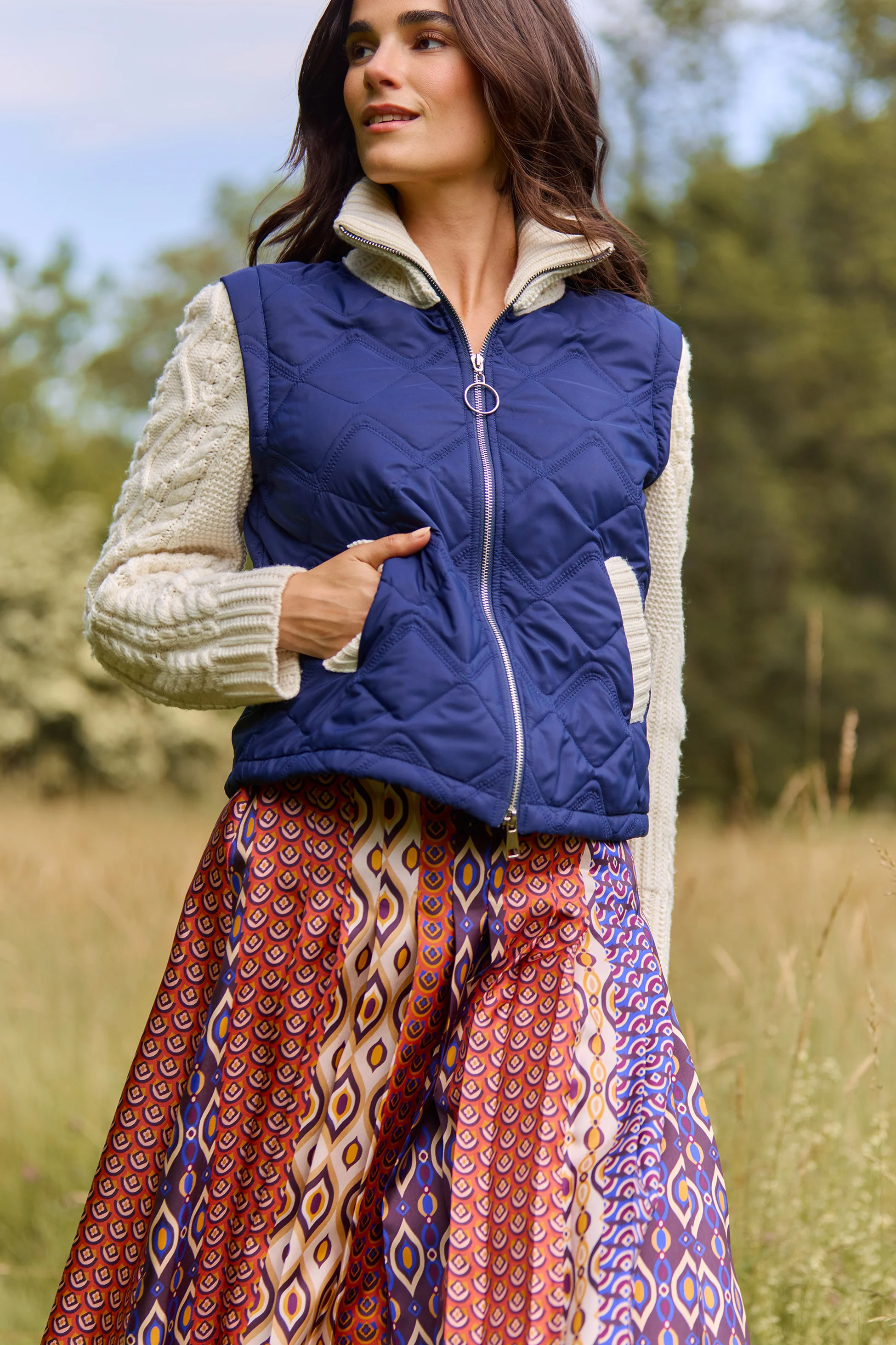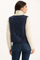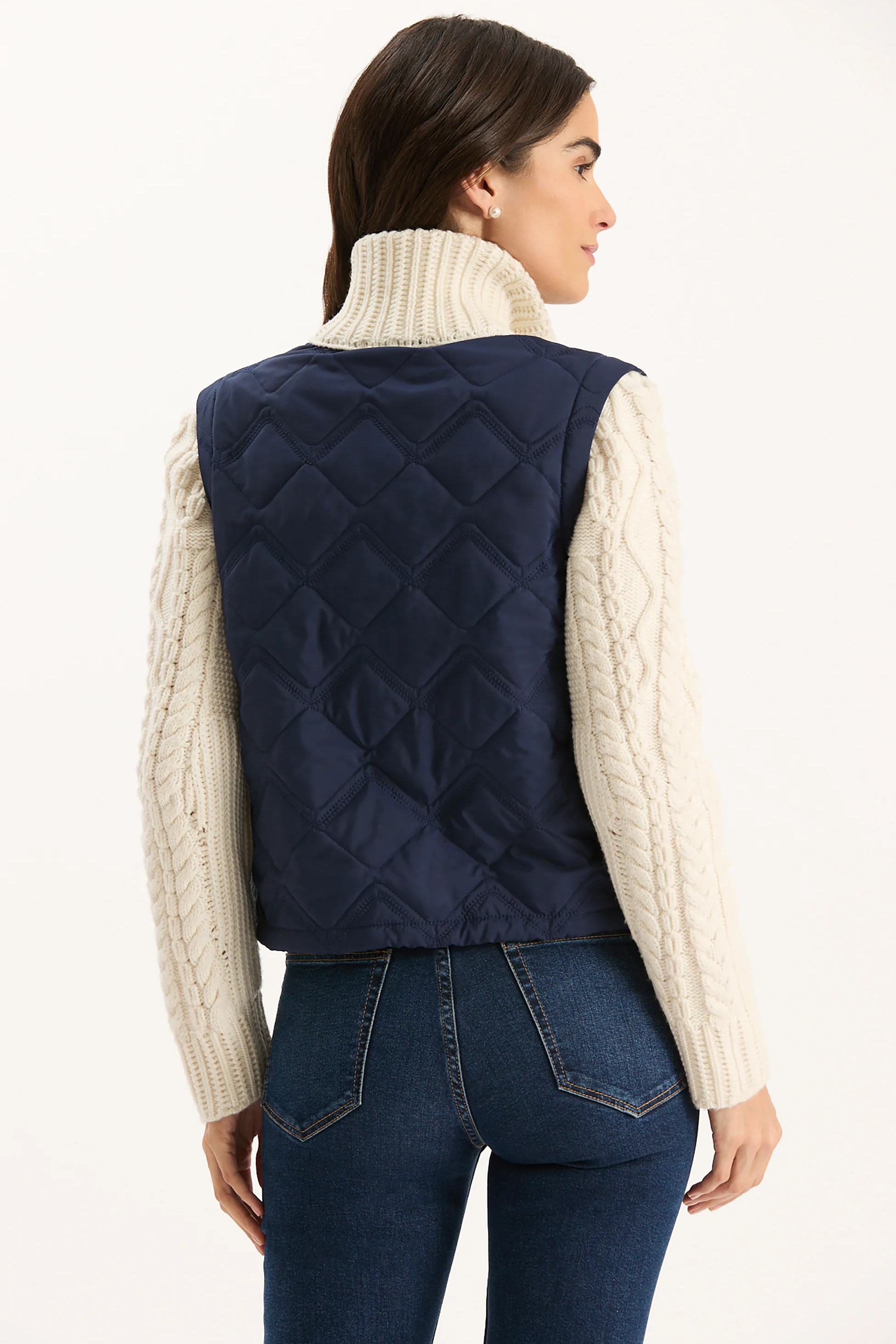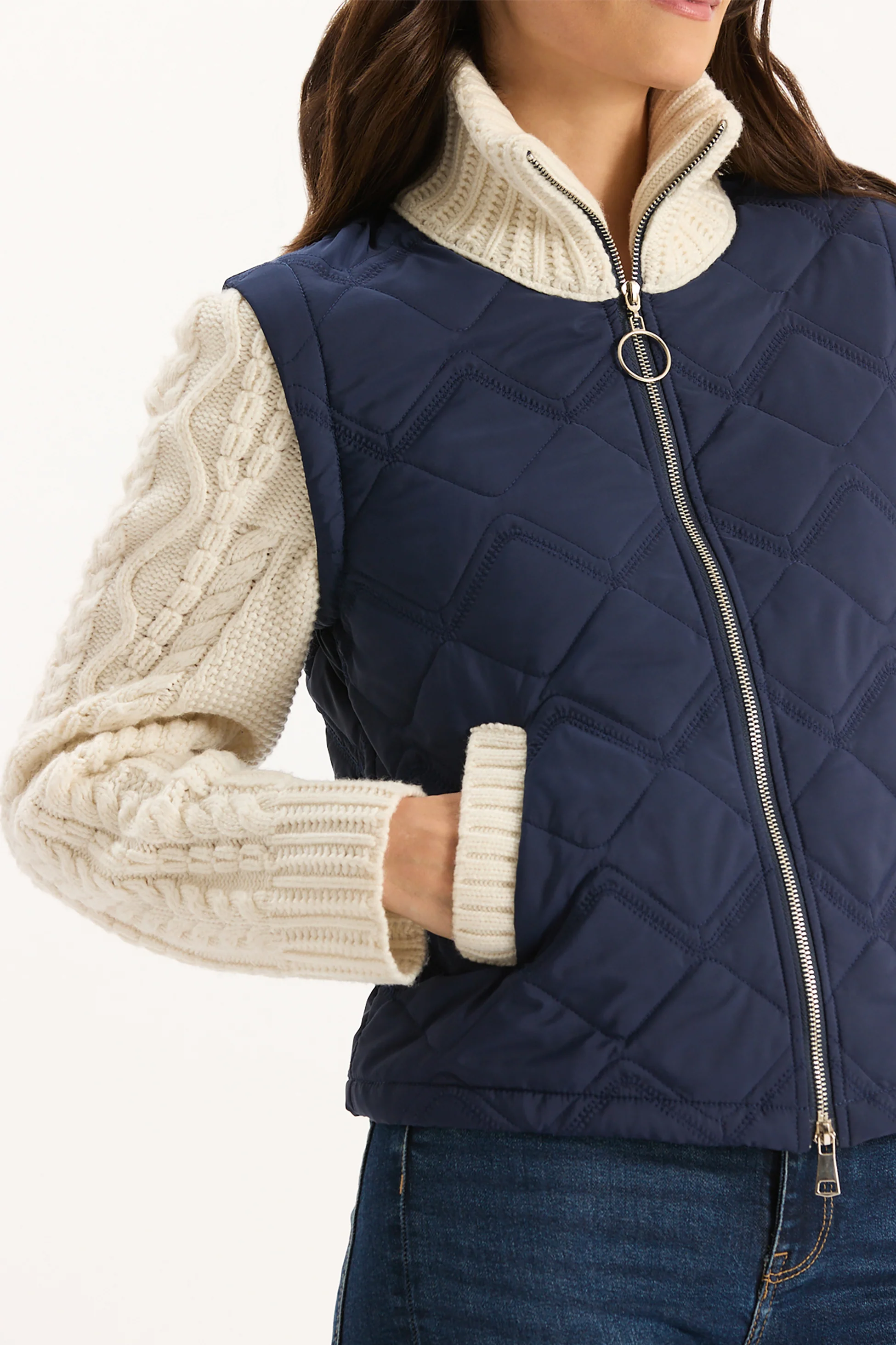 A chic and versatile mixed-media jacket designed for effortless layering. The Andie Jacket features a quilted body with a classic diamond pattern, adding texture and timeless style. The cable-knit long sleeves provide cozy comfort and contrast, blending casual ease with refined detailing. Complete with a full-zip front and side pockets, this jacket is the perfect transitional piece for polished everyday wear.