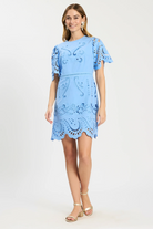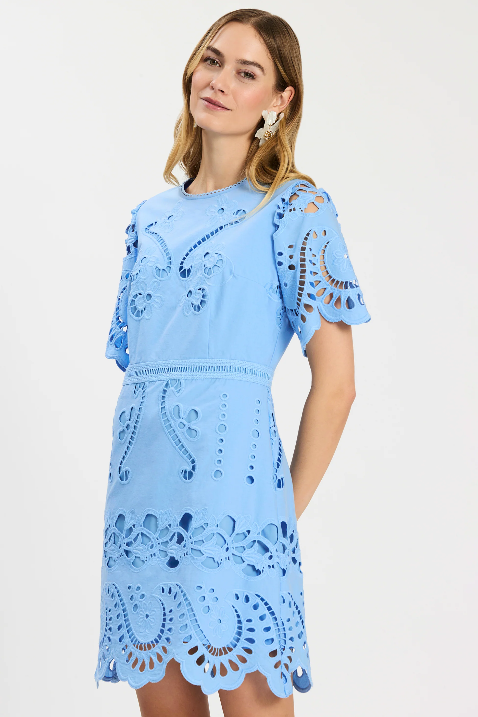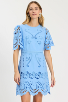 A beautifully detailed warm-weather dress designed to make an effortless statement. Crafted in beautifully detailed eyelet with intricate embroidery and scalloped edges, this feminine silhouette feels both polished and breezy. Softly structured sleeves and a defined waist create a flattering shape that moves seamlessly from daytime celebrations to summer evenings. Perfect for weddings, vacations, and seasonal events, it pairs beautifully with sandals or wedges for an elevated warm-weather look.