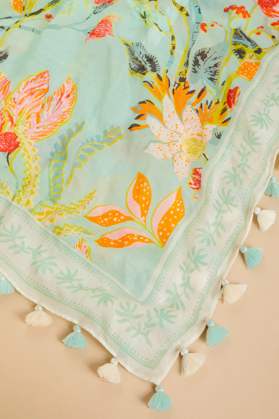 Fringed tassels around border.