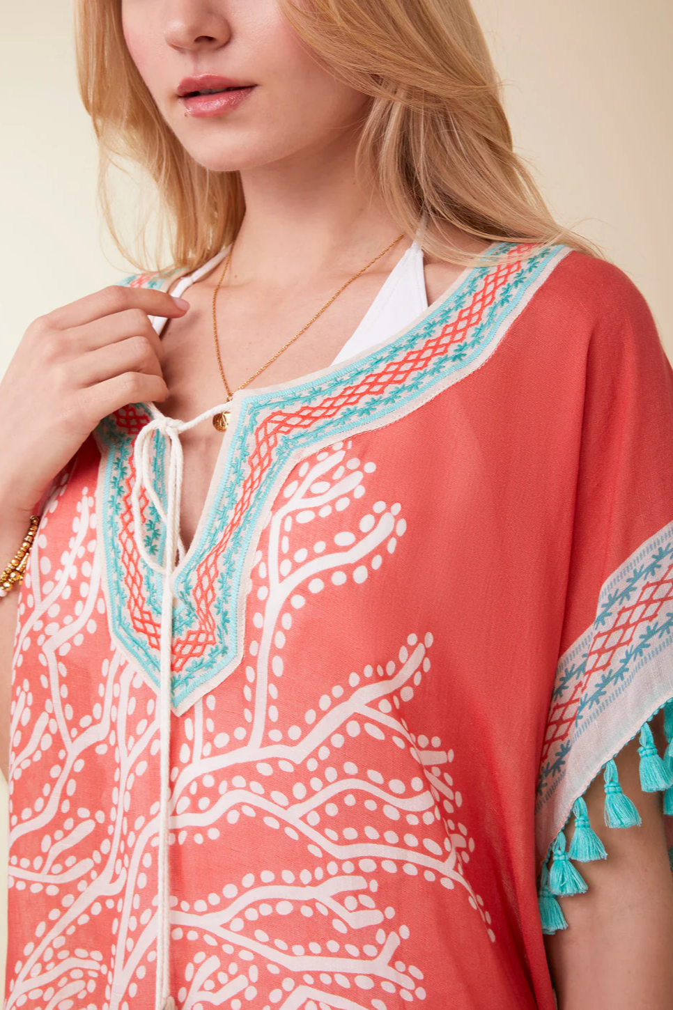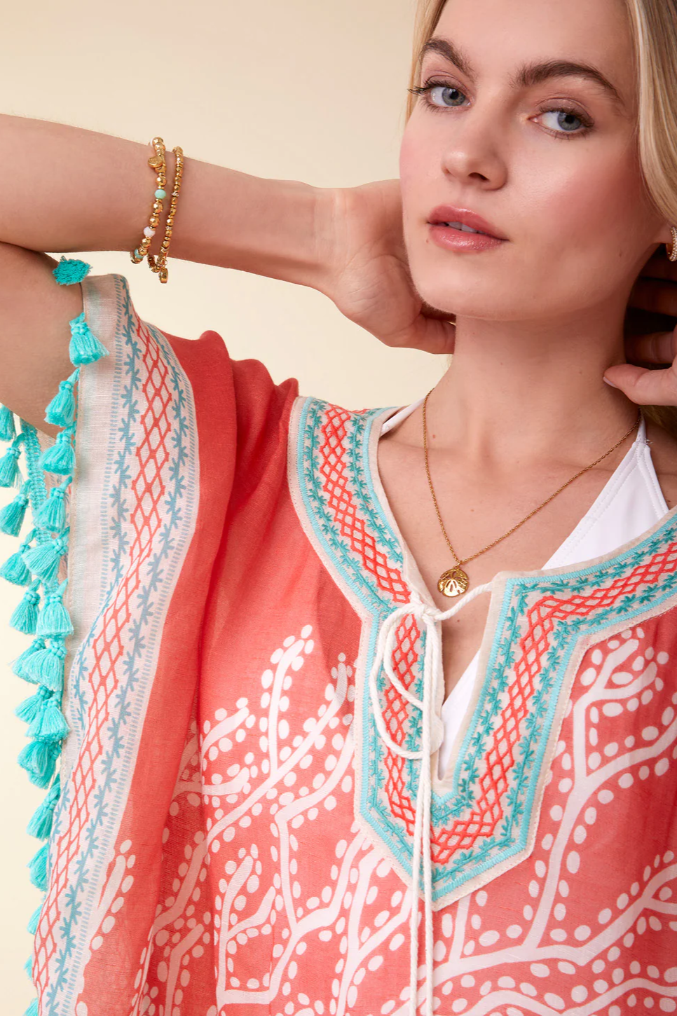With such a beautiful print, we might as well call this a show-off! Soft modal and linen. Intricately designed neckline border. Fringe tassels all around. Luxurious resort wear made for you in this one size Beach Kaftan that blows in the coastal breeze. This flowy, V-neck pullover makes beach days a breeze. Grab the matching tote to complete the look!