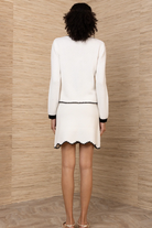 A textured black-and-white cardigan detailed with pearl-style buttons and contrast trim. The Black & White cardigan with pearl buttons from Hale Bob has a classic, boxy silhouette and patch-pocket styling that reads polished and timeless. Knitted diamond texture gives the sweater body visual interest while the crew neckline keeps the look refined. Wear it to the office or layered over weekend outfits for an elevated, preppy finish.