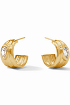 Inverted teardrop-shaped gemstones decorate these fluted, softly tapering golden hoops textured with subtle hand-hammering.