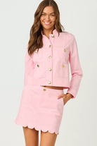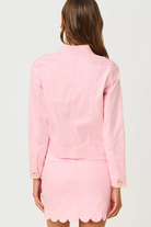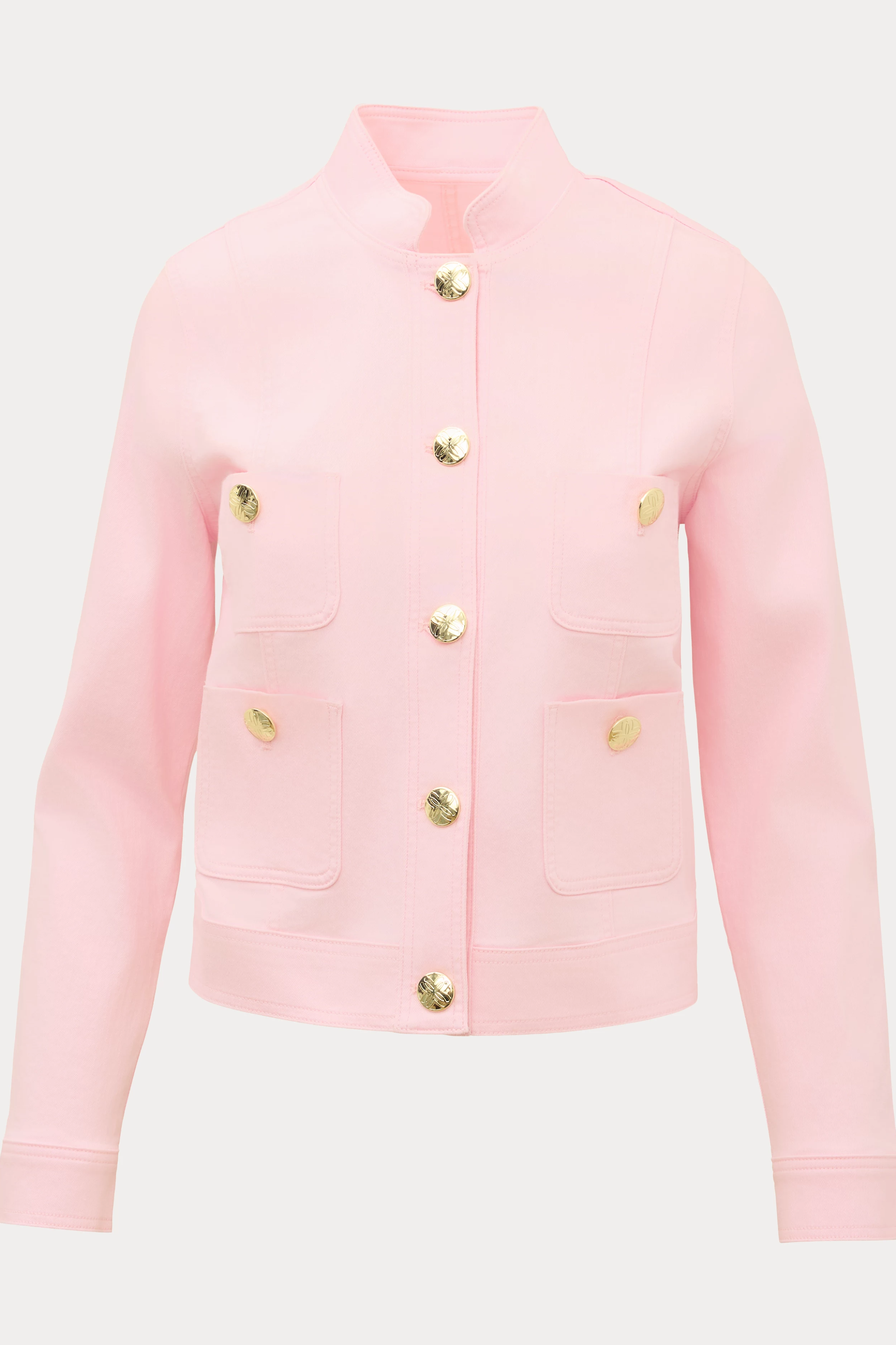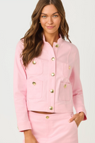 A soft pink denim jacket with a structured, military-inspired silhouette and polished gold buttons. The Denim Pink Muse Jacket by Lilly Pulitzer is crafted from denim and features front patch pockets and a short, waist-length cut. It's a chic, feminine layering piece that dresses up casual outfits while keeping a tailored feel. Ideal for spring outings and weekend wear.