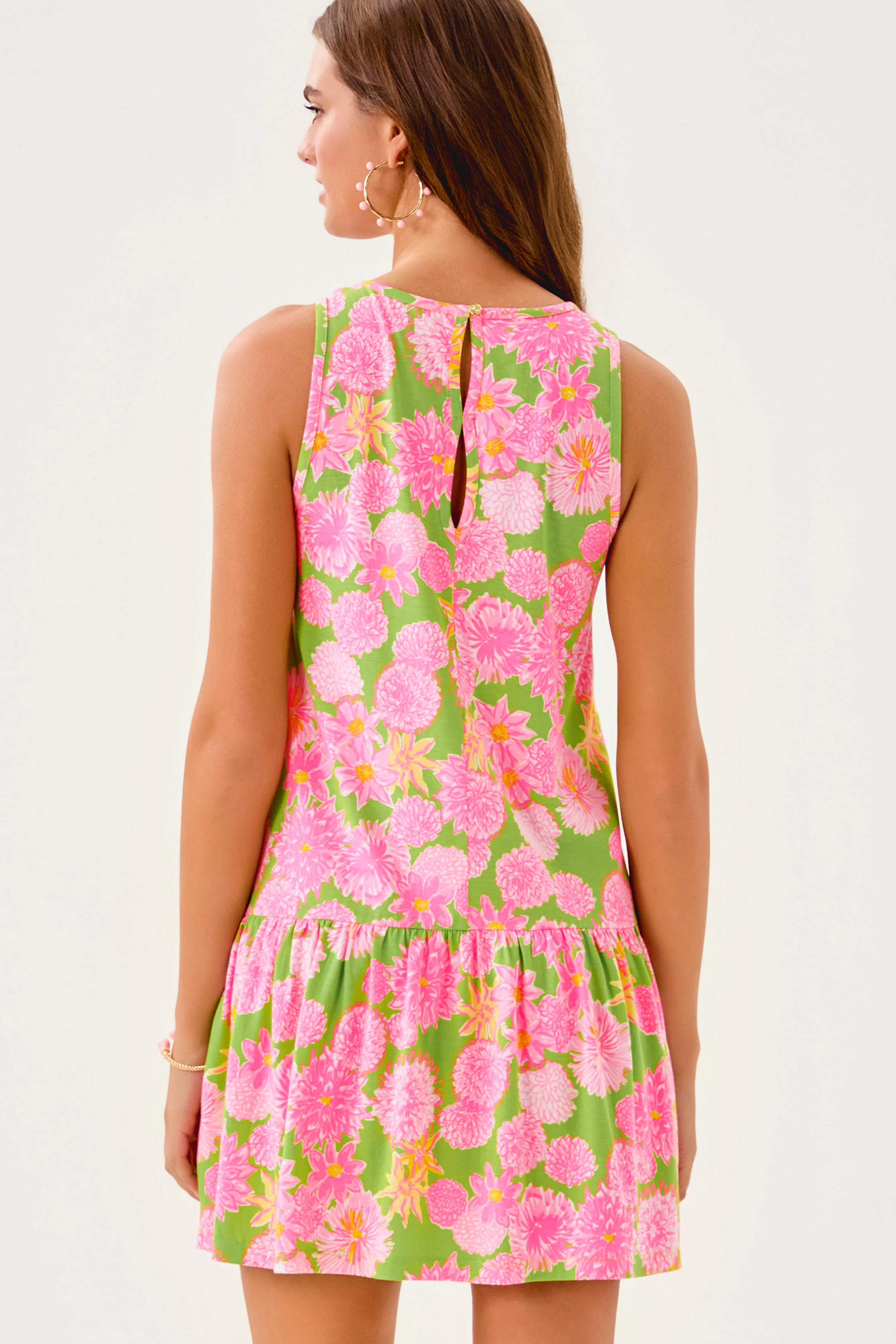 Swing fit tank dress with cut-in armholes, a back keyhole detail, and a tall hem ruffle.
