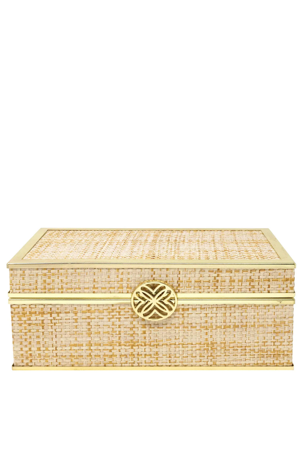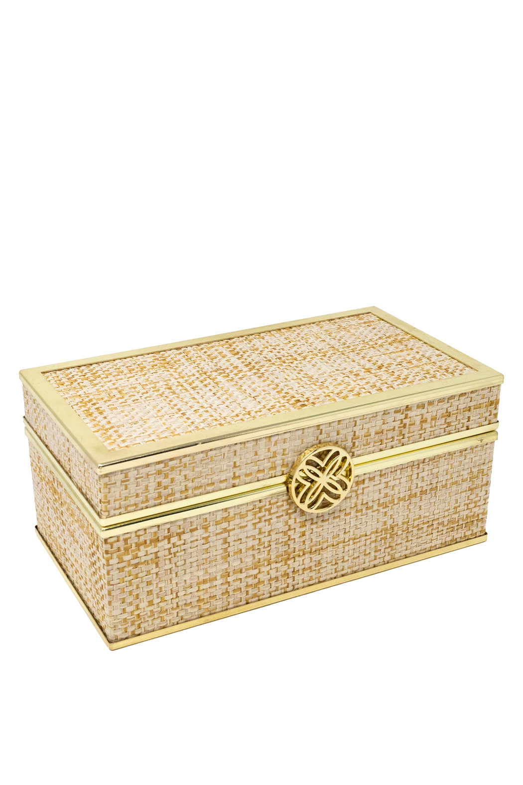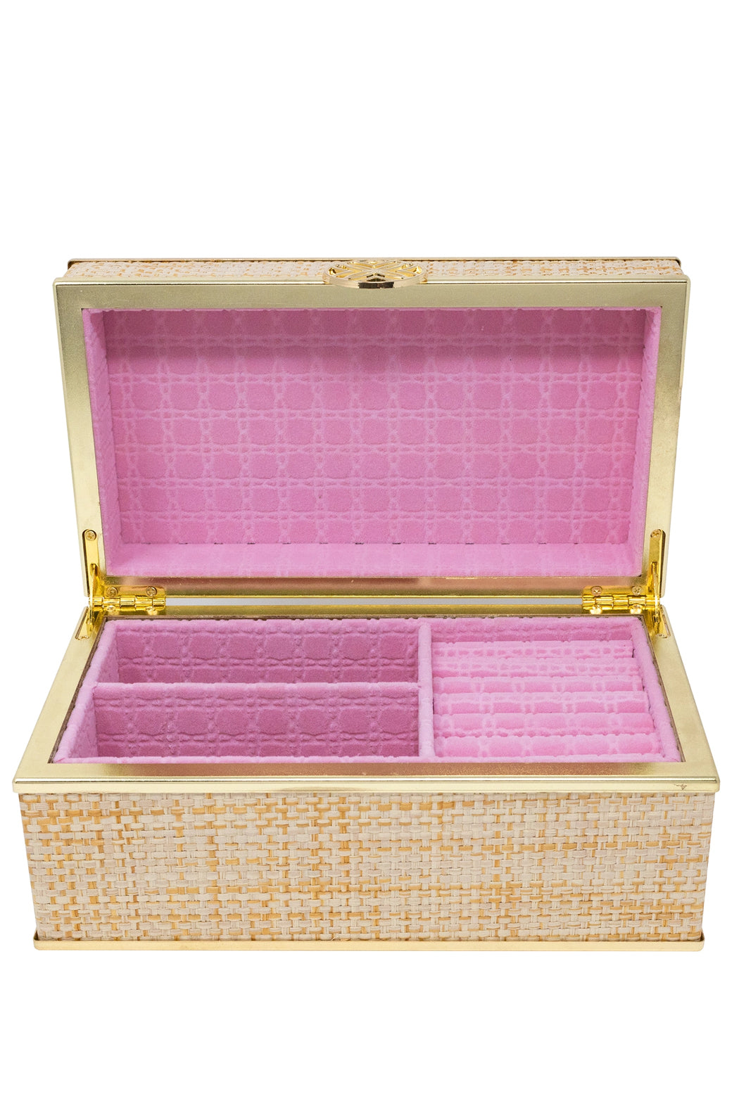 Blending textural gold raffia with Lilly Pulitzer’s iconic design sensibility, this jewelry box embodies Lilly's legacy of bold aesthetics and effortless glamour. Perfect for safeguarding your favorite pieces, it features a structured interior to keep your treasures organized while bringing a touch of Palm Beach elegance to any dresser or vanity.
