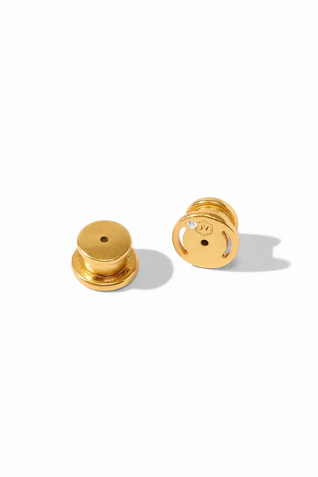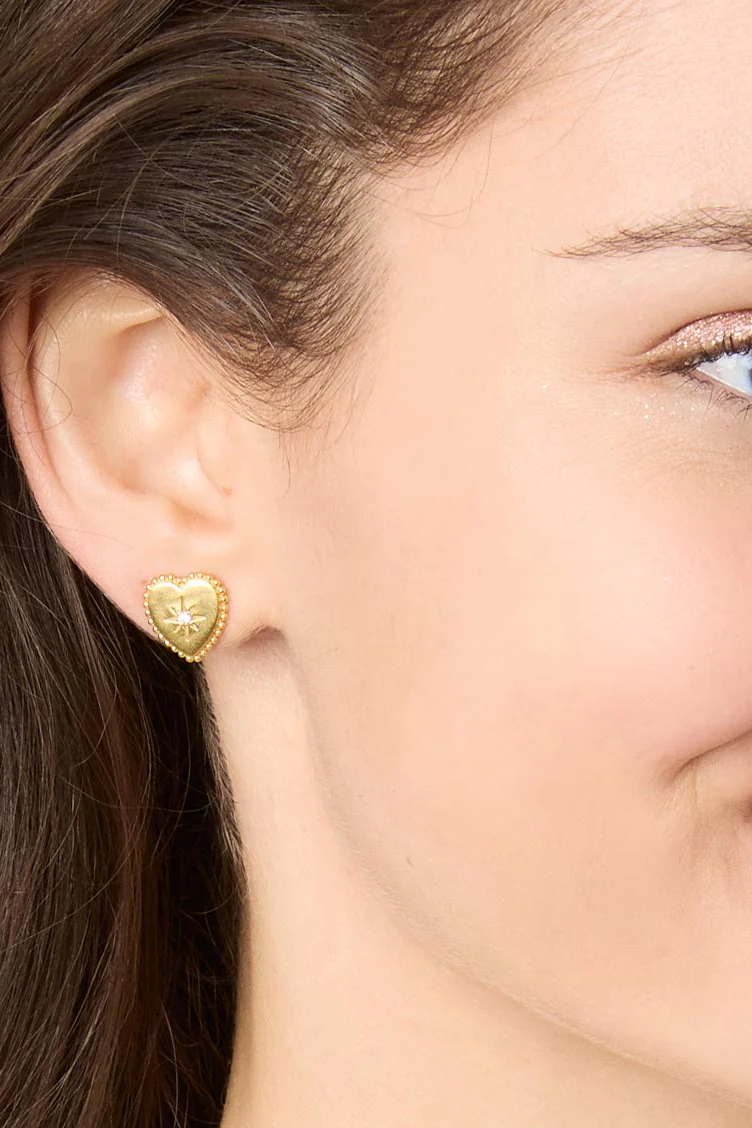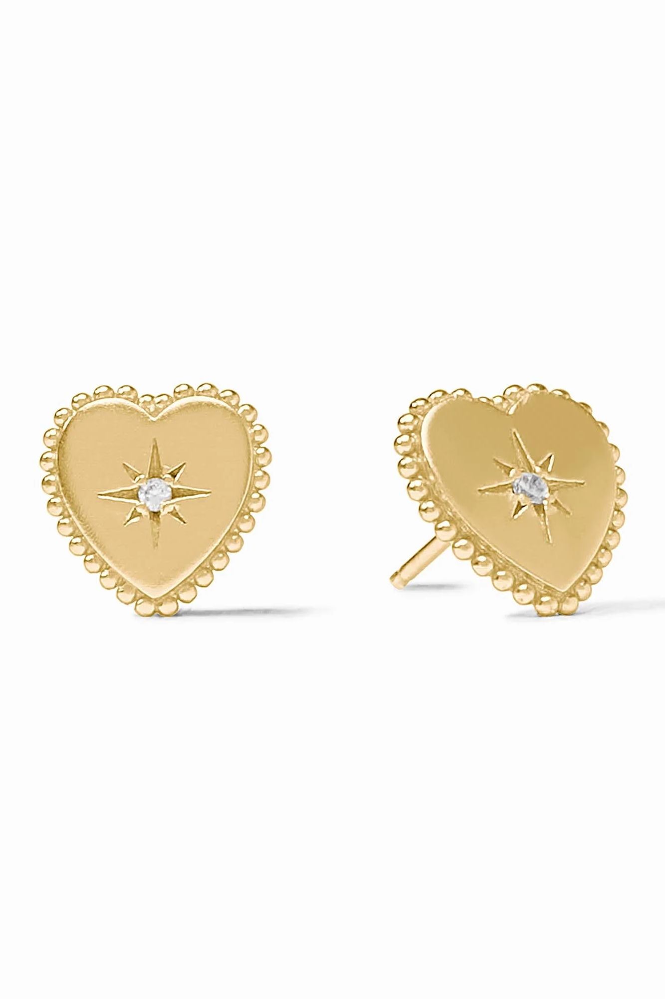Each of these vintage-inspired golden heart studs features sparkling engraved gemstone stars and delicate beaded edges.