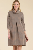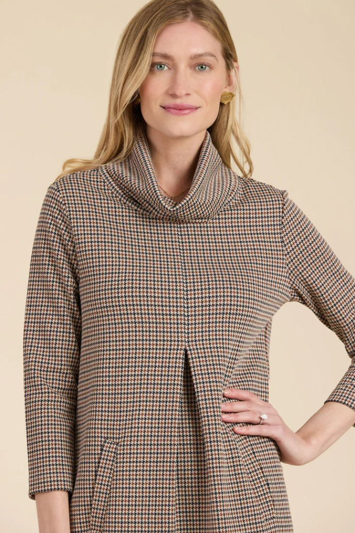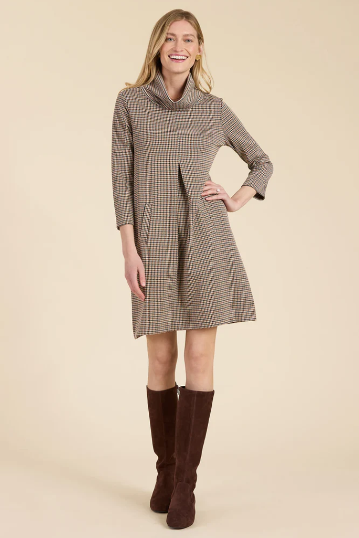Our #1 best-selling dress, Kim is a must-have for fall. Classy and cozy with a chic cowl neck, made in our signature, wrinkle-free knit fabric. Whether you dress her up or down, Kim is an easy throw-on-and-go. Featured here in a classic houndstooth pattern, perfect for the fall season.
