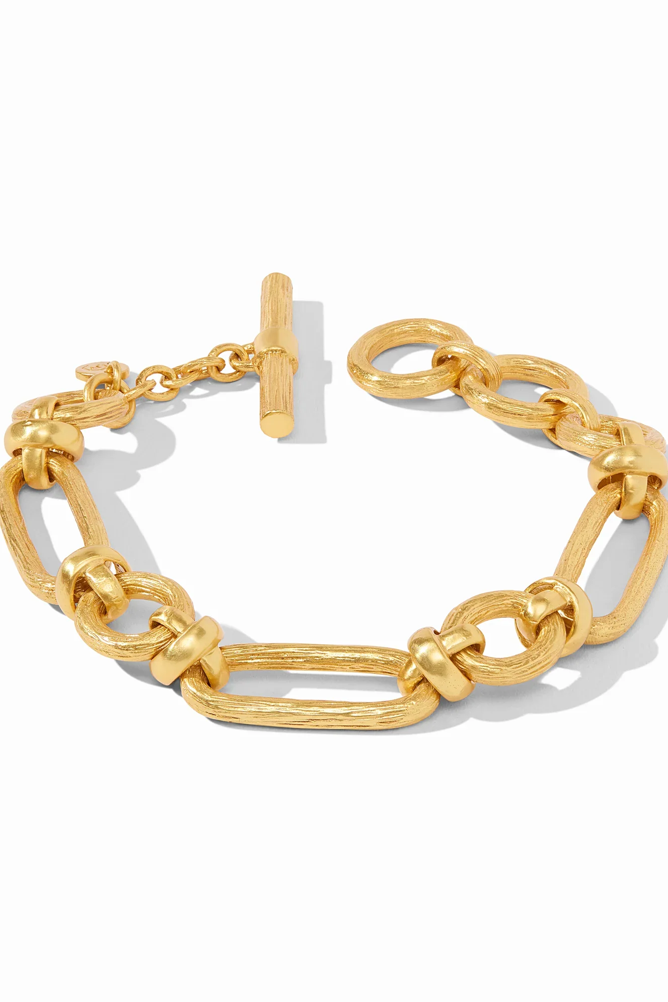 The golden links of this bracelet are delicately hand-etched and contrast with the polished cross links connecting them.