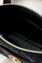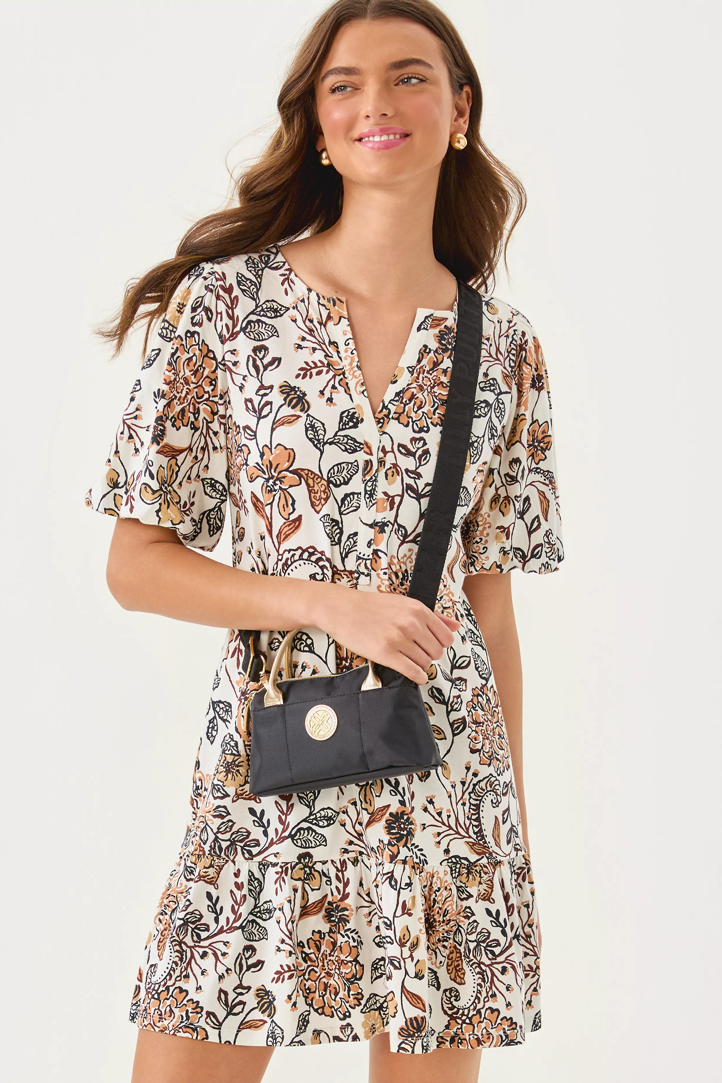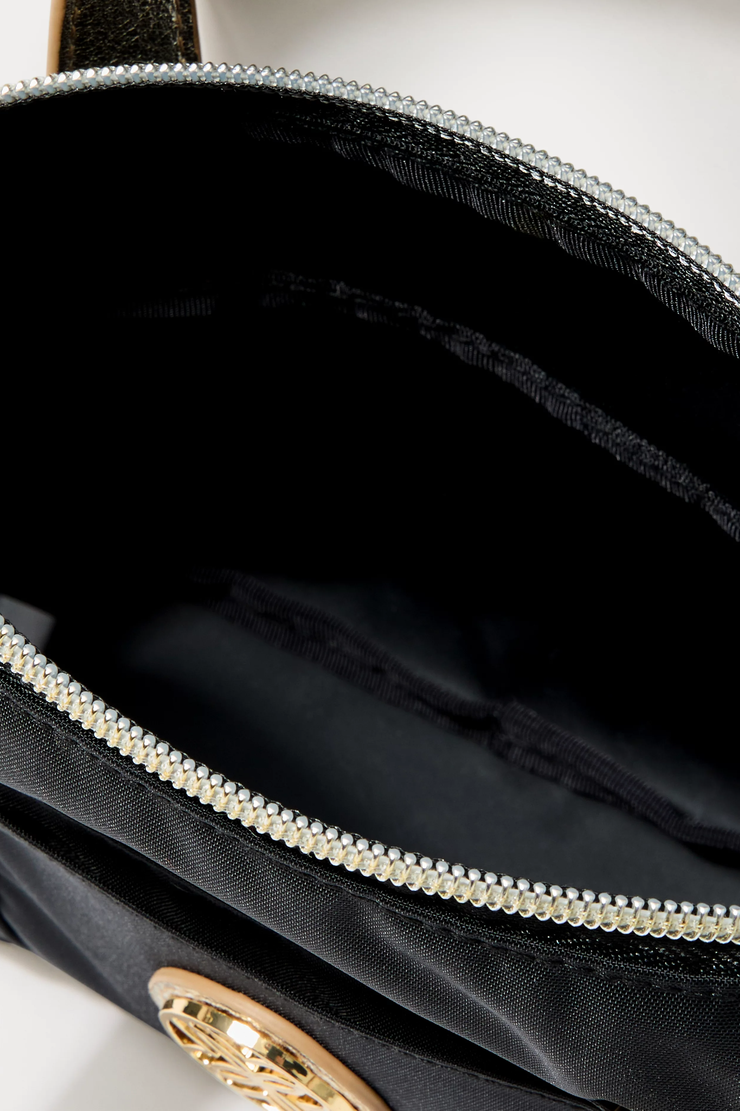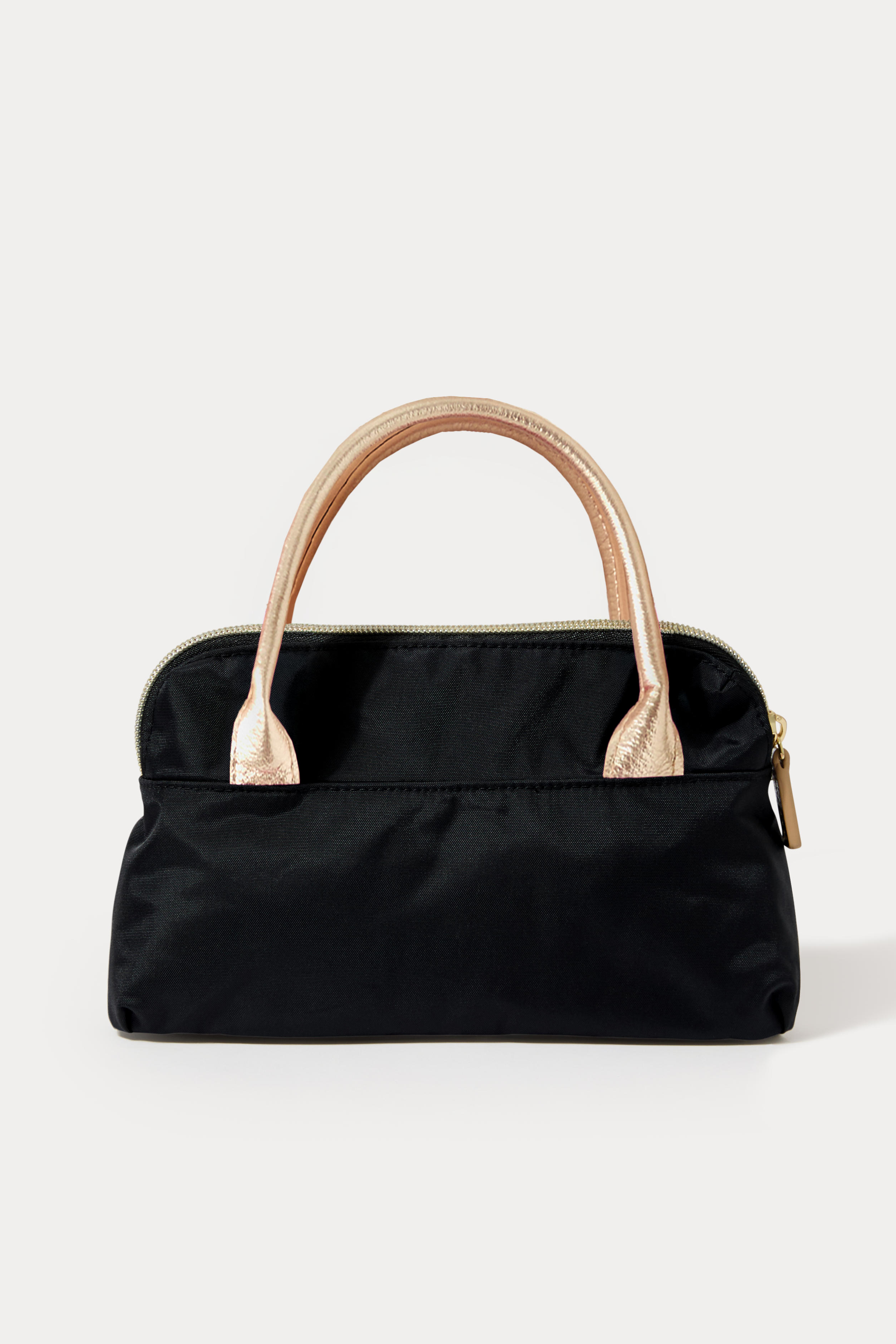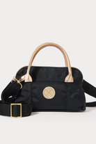 Nylon top handle mini bag with a front slip pocket, zip top closure, and detachable logo jacquard webbing crossbody strap.