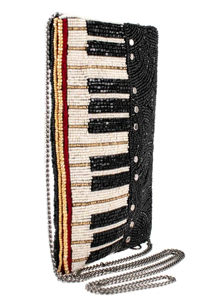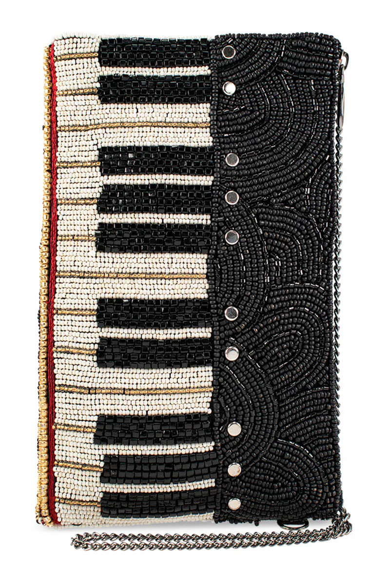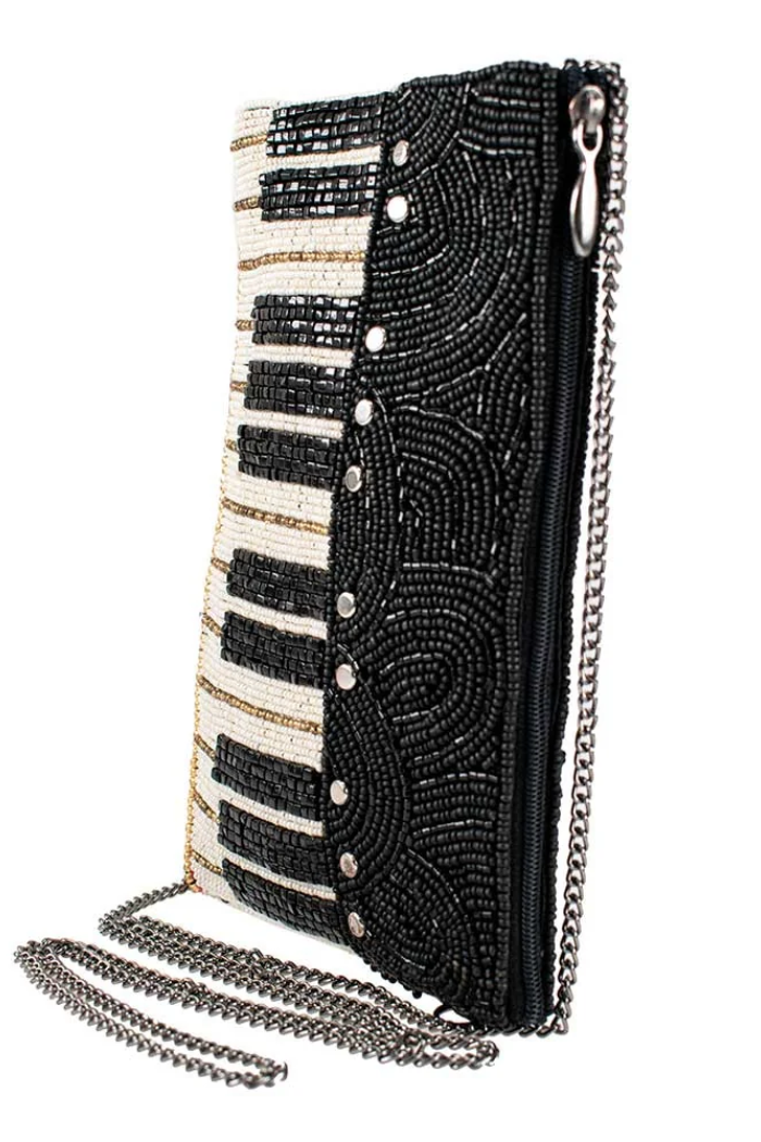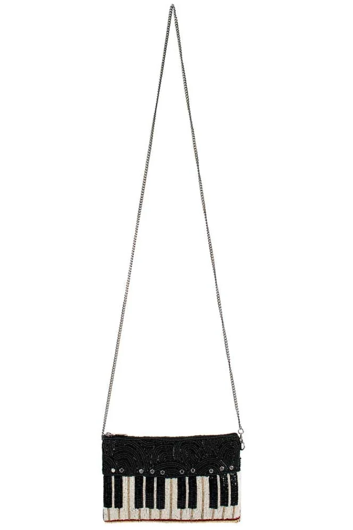 This piano-shaped crossbody phone bag is sure to impress, with white, black, and gold beads. This beaded bag with hand-laid beads can fit your phone and other essentials so you can maintain a playful and perky sense of style.