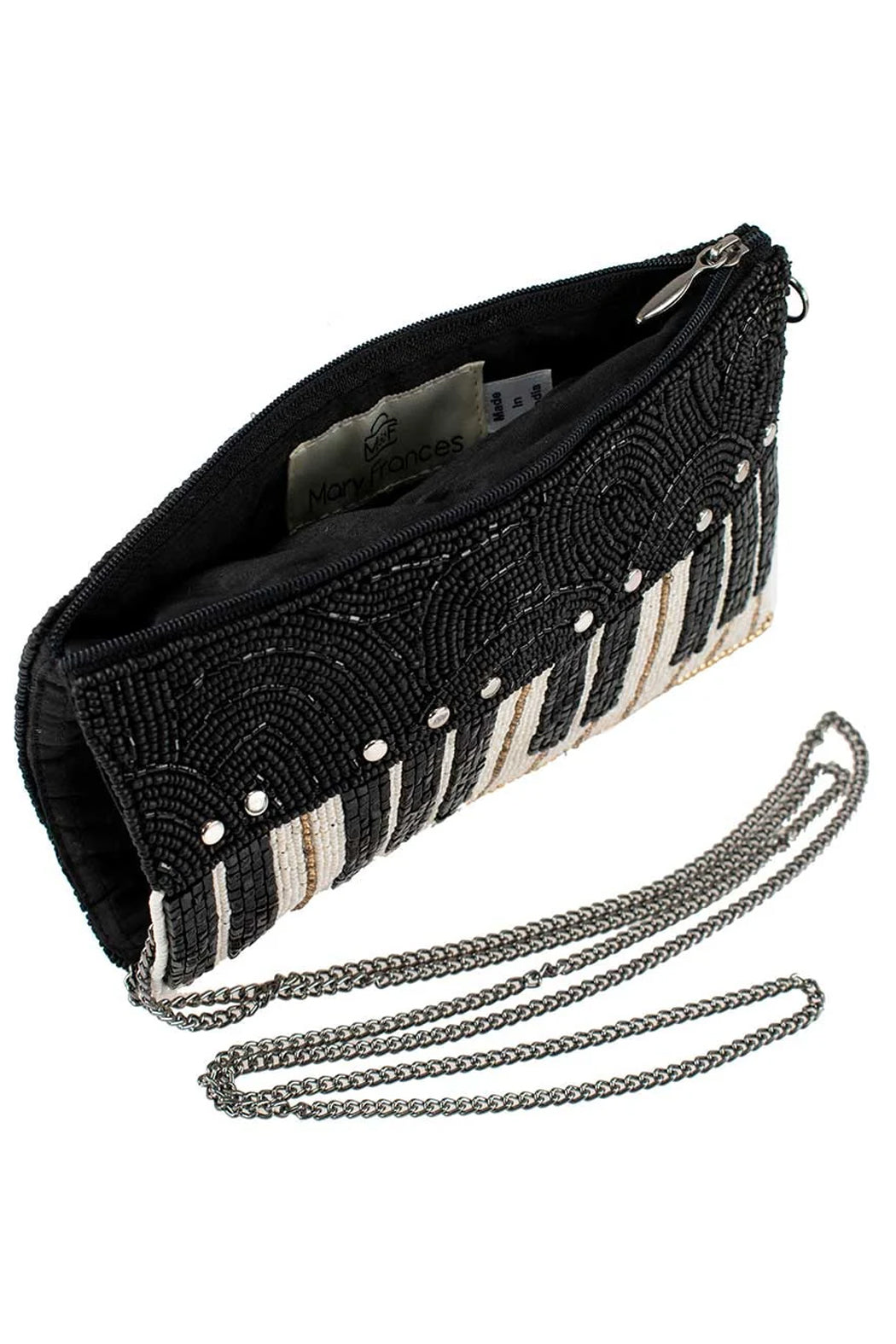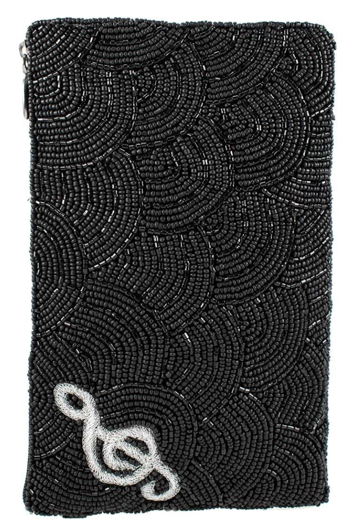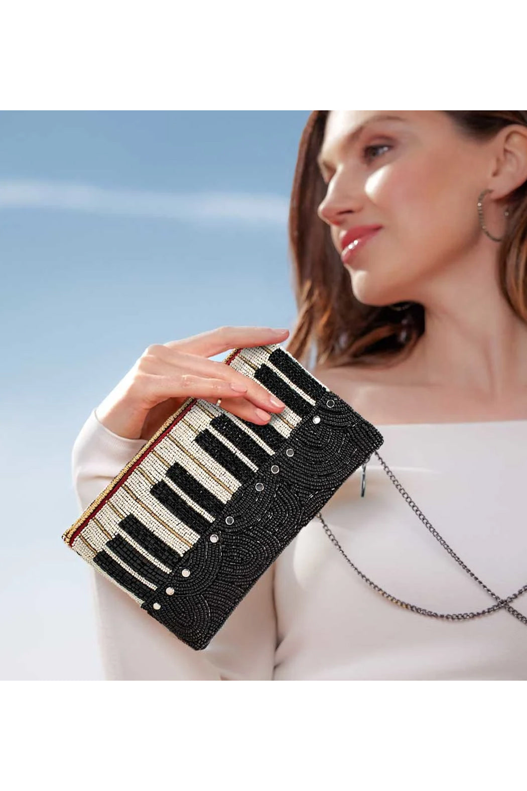 This piano-shaped crossbody phone bag is sure to impress, with white, black, and gold beads. This beaded bag with hand-laid beads can fit your phone and other essentials so you can maintain a playful and perky sense of style.
