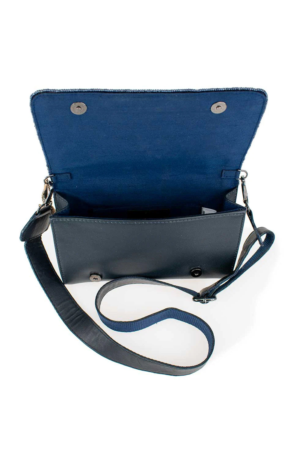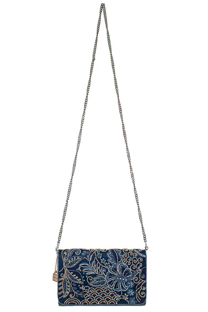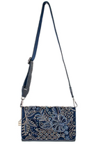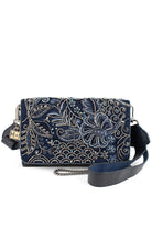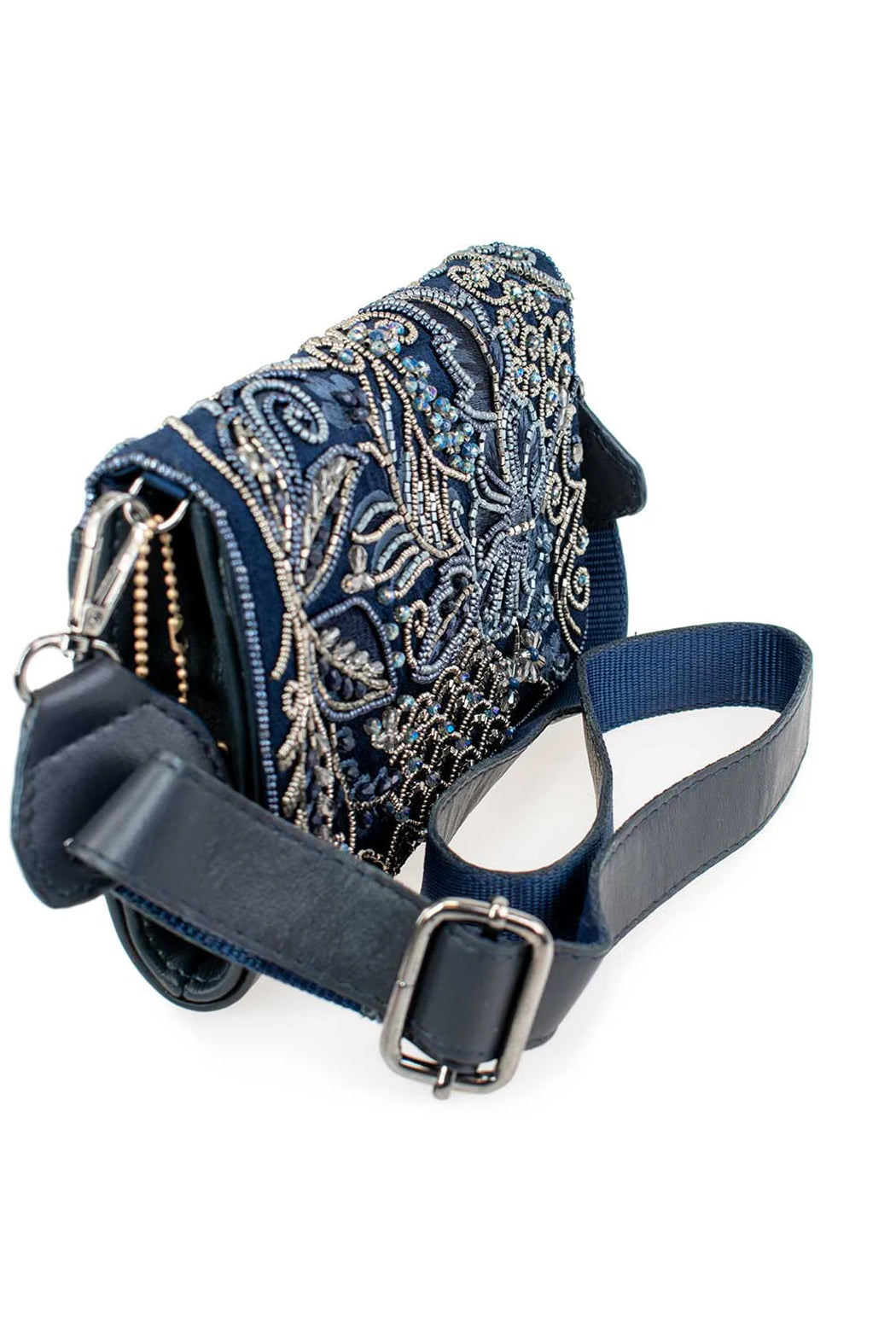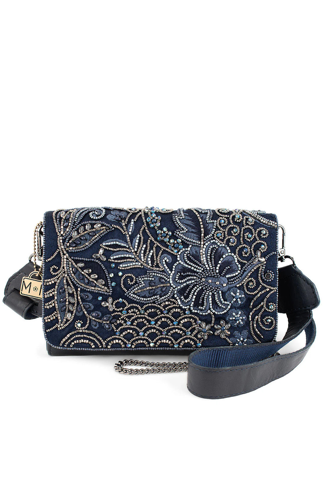 Fashion meets function in our new waist bags. Wear it your way with both a crossbody chain strap and an adjustable leather waist strap. Kismet is hand-beaded and embroidered in an exquisitely detailed navy blue and pewter tropical floral print and the soft leather body is comfortable to wear and creates a roomy interior for all your essentials.