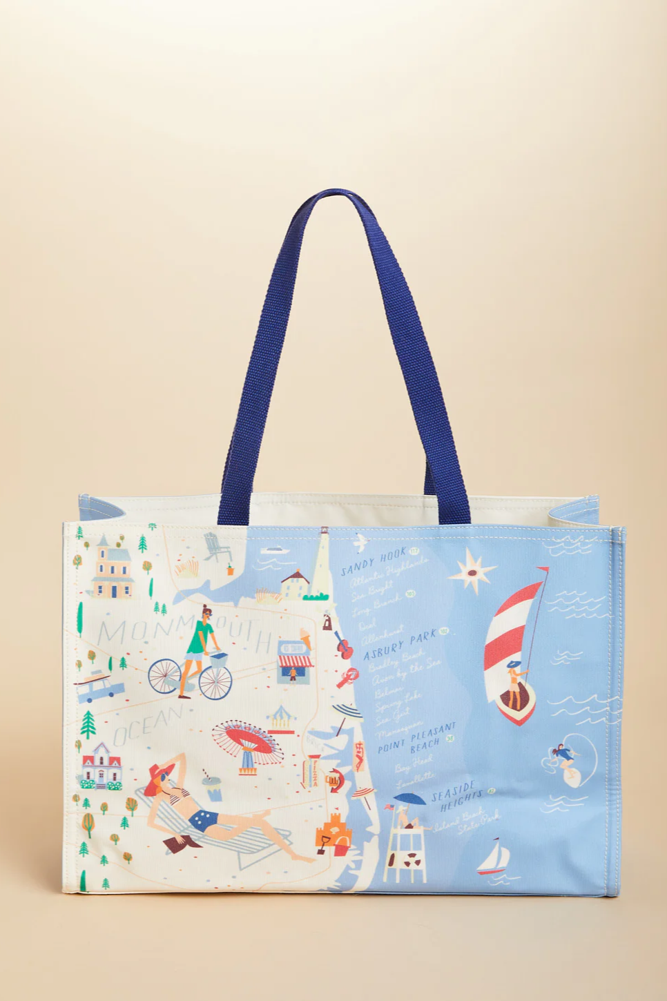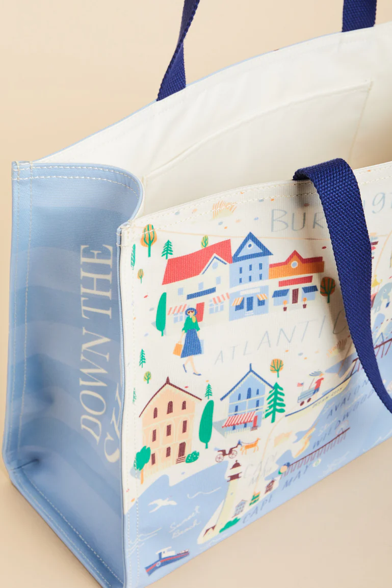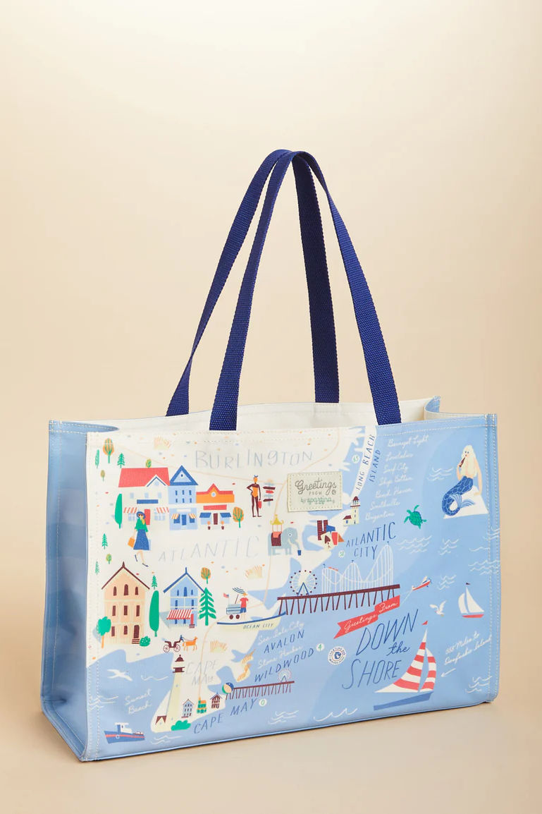 Our best-selling tote meets our best-selling map illustration patterns in our Greetings From Market Totes. Made of durable, easy-to-clean laminated cotton, throw the thick, cotton-webbed straps over your shoulder and head to the market or beach with your goodies stowed away in the roomy interior with one interior slip pocket.