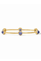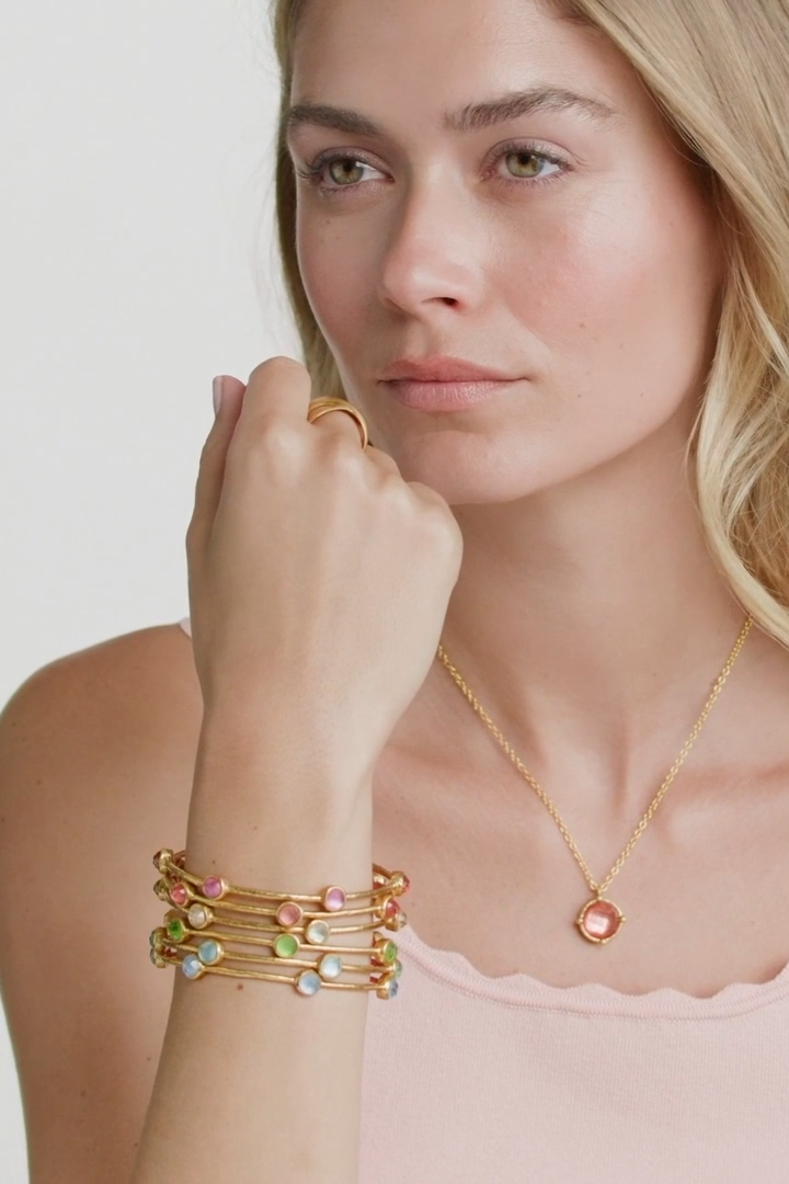 A lightly hammered bangle embellished with six iridescent gemstones stations.