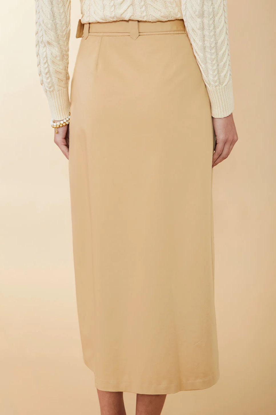 A tailored look without the work, our Paola Midi Skirt's durable, wrinkle-resistant cotton twill is complemented by a khaki hue with tortoise shell buttons and a flattering belt.