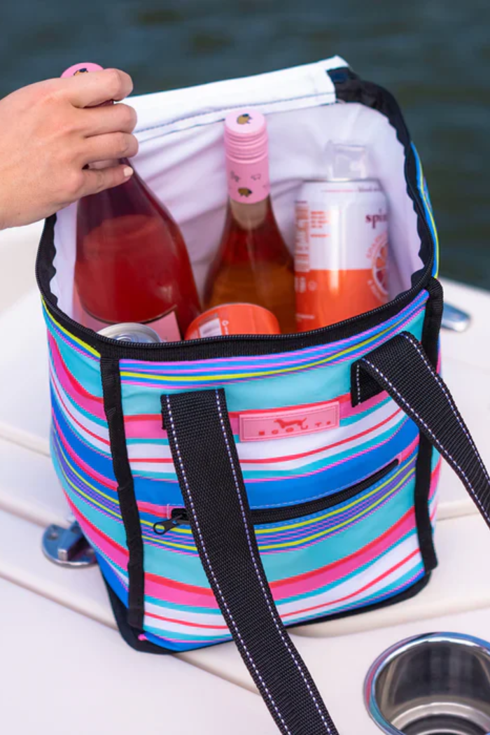 YOU HAD ME AT 5 BOTTLES OF WINE (UPRIGHT). The perfect size for small family outings, road trips, or a 12-hour shift, this tall, square cooler is a great shape for stacking containers. Stash napkins, utensils, or chocolate bars (no judgement!) in the outside pockets for quick access. Remember ice packs! Because it squishes flat in your suitcase, we love the Pleasure Chest for travel, and it makes a great leave-behind hostess gift.
