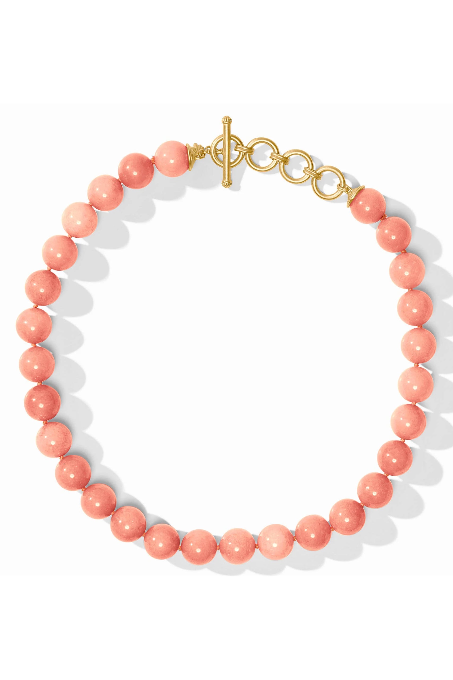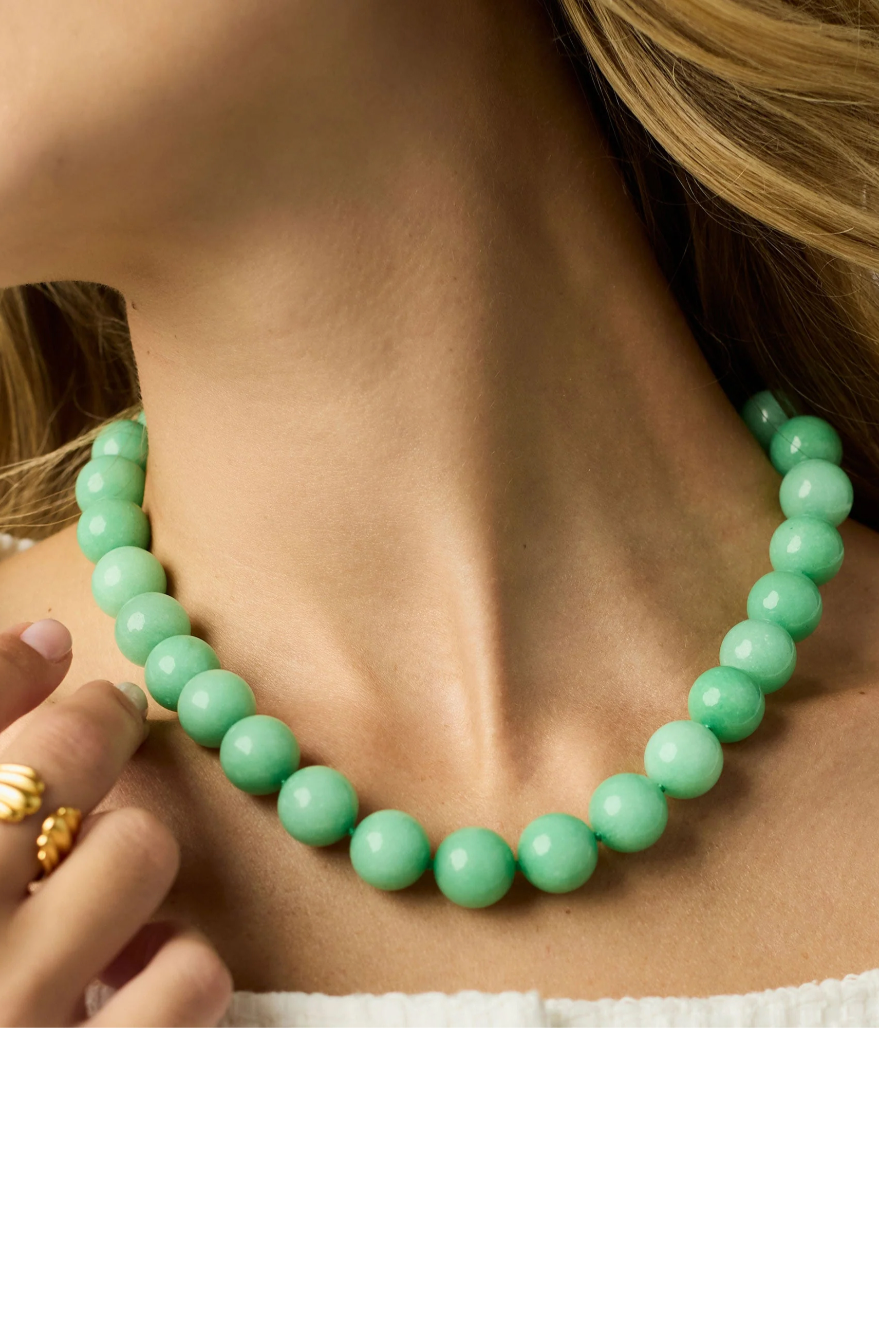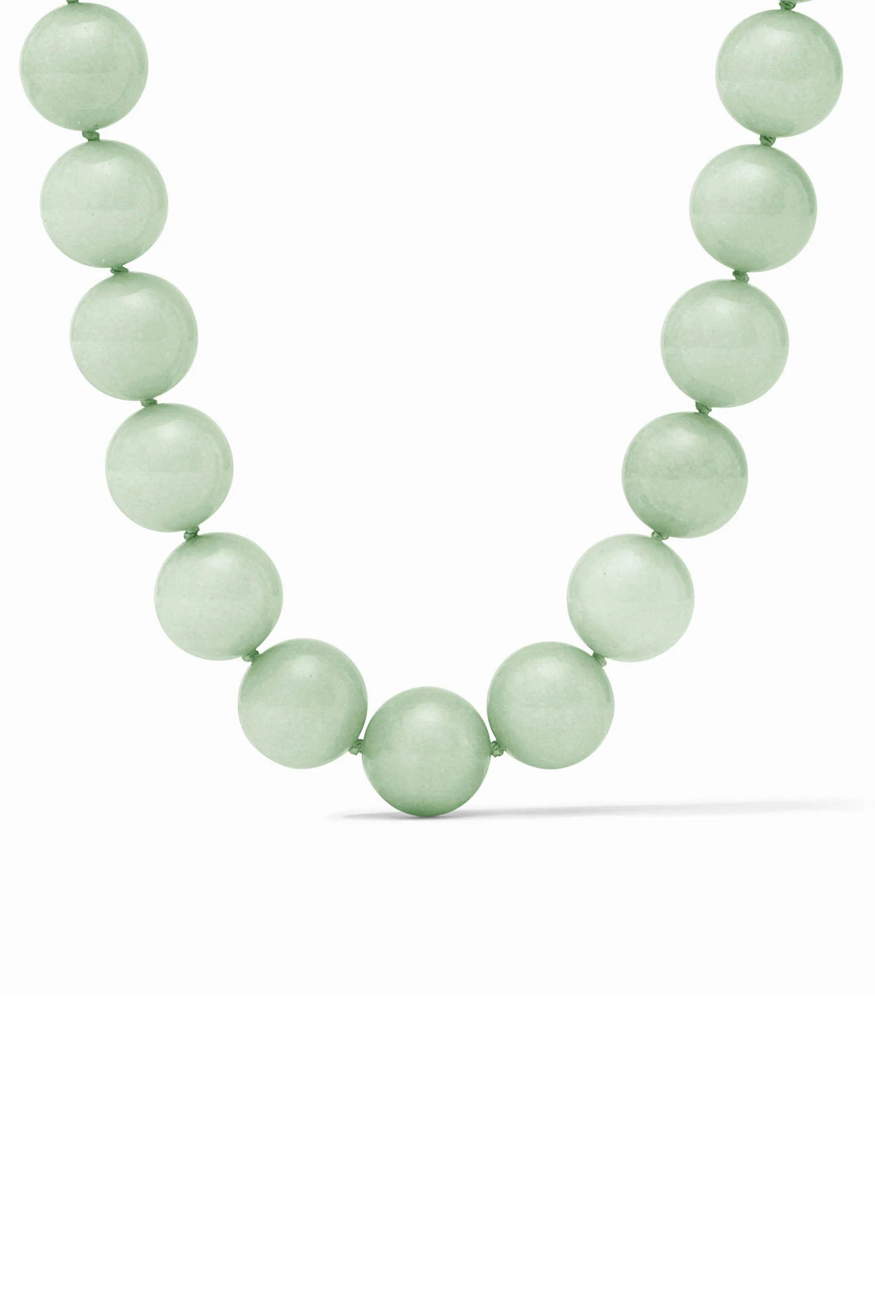 A strand of glossy aqua jade beads forms a bold, sculptural silhouette in this Portofino beaded necklace. The round, uniform beads are knotted on silk and finished with a gold-tone toggle clasp for easy wear. Julie Vos designed this statement piece to add bright, polished color to simple dresses or elevated daytime looks.