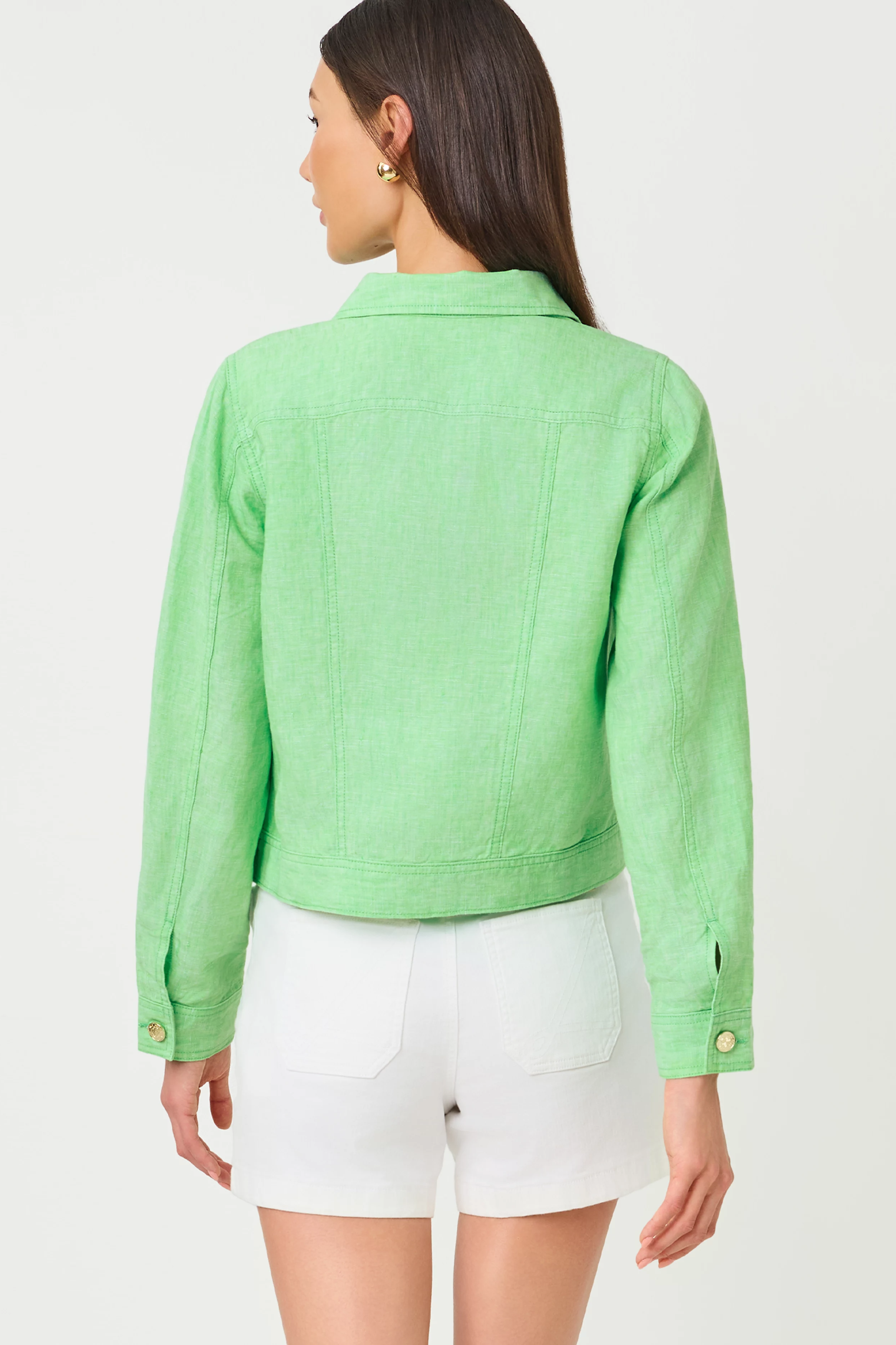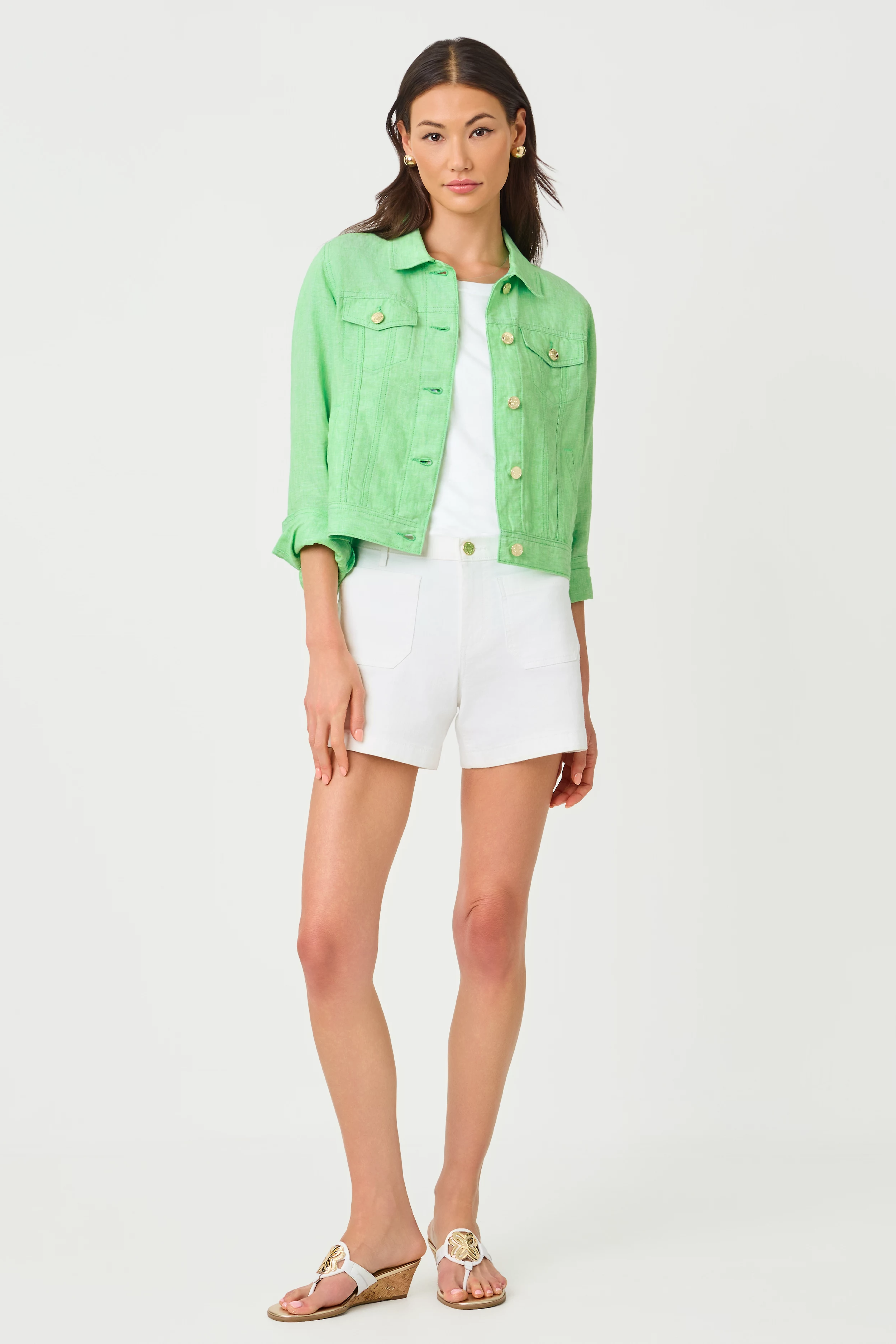 A lightweight structured jacket in a bright seaspray green linen weave with gold-toned buttons and flap chest pockets. The Seaspray Linen Jacket features a classic shirt collar and a slightly cropped, hip-length silhouette ideal for layering. This piece is by Lilly Pulitzer and brings a polished yet relaxed look to warm-weather outfits.