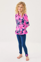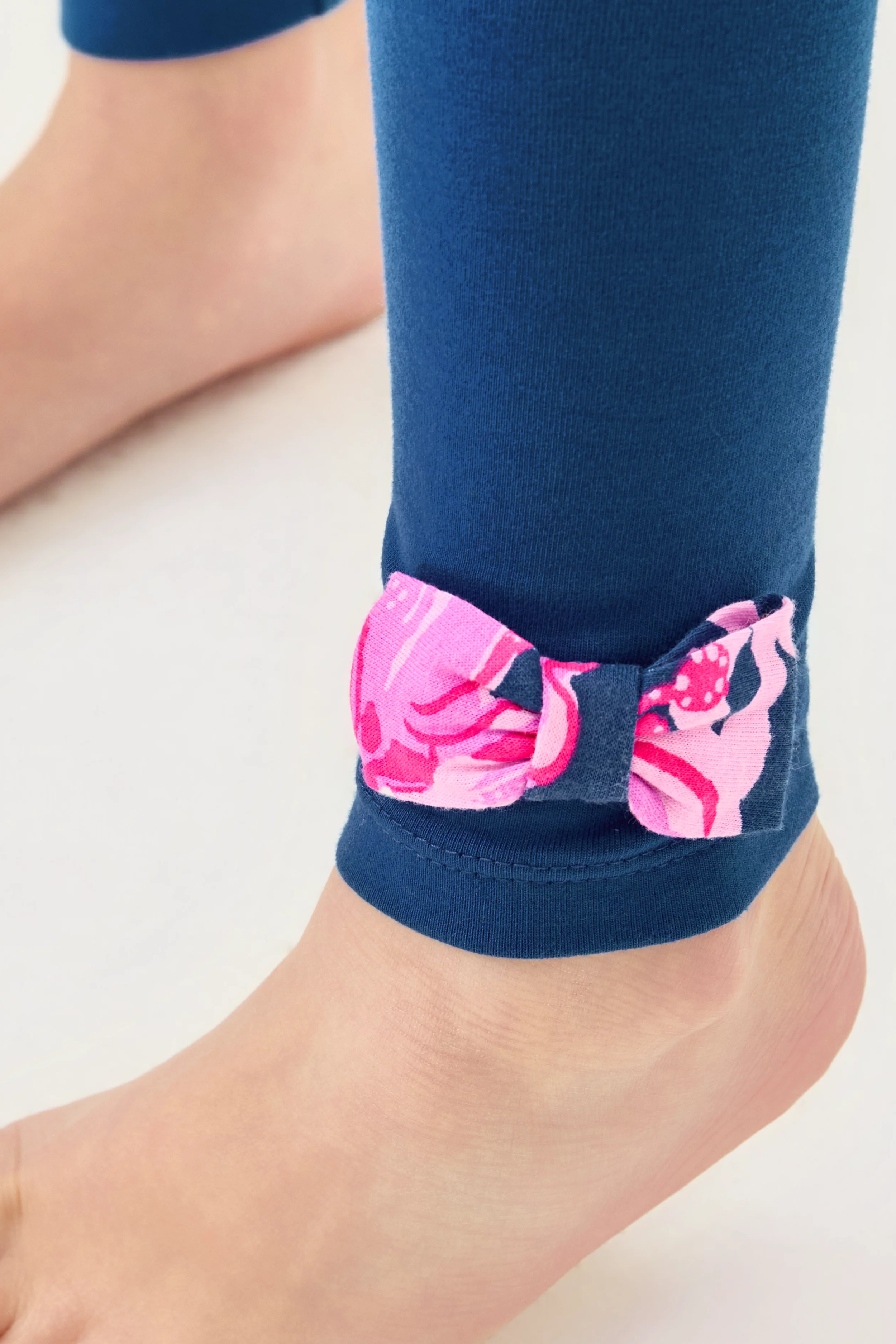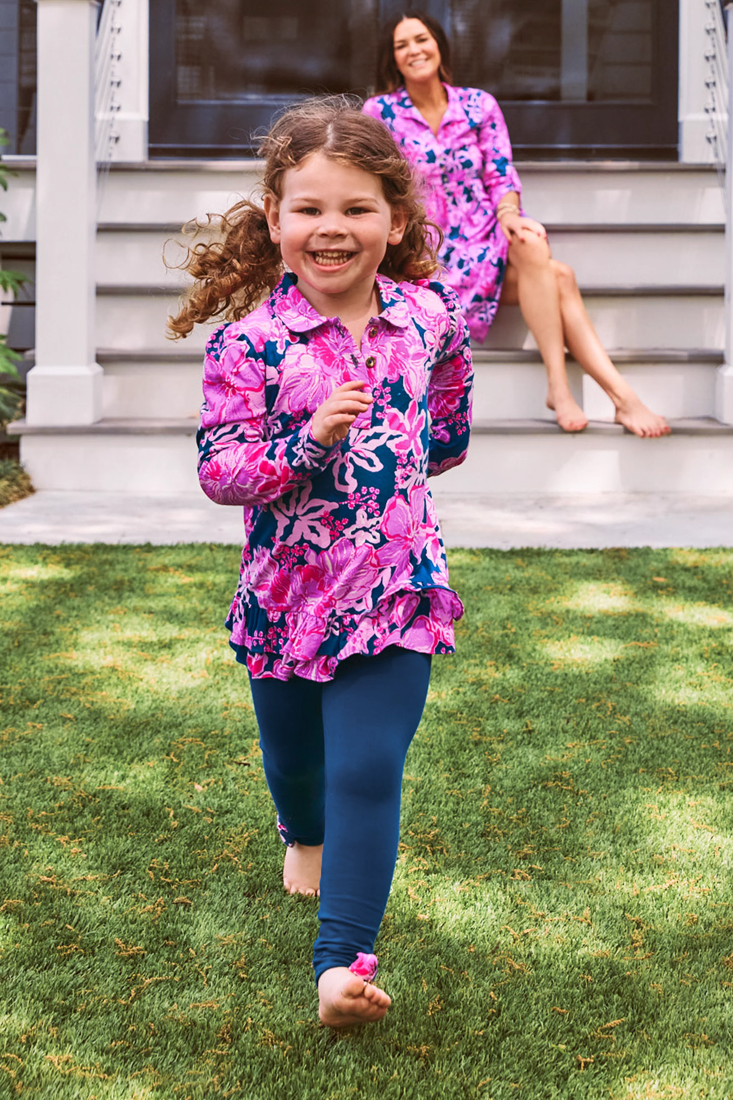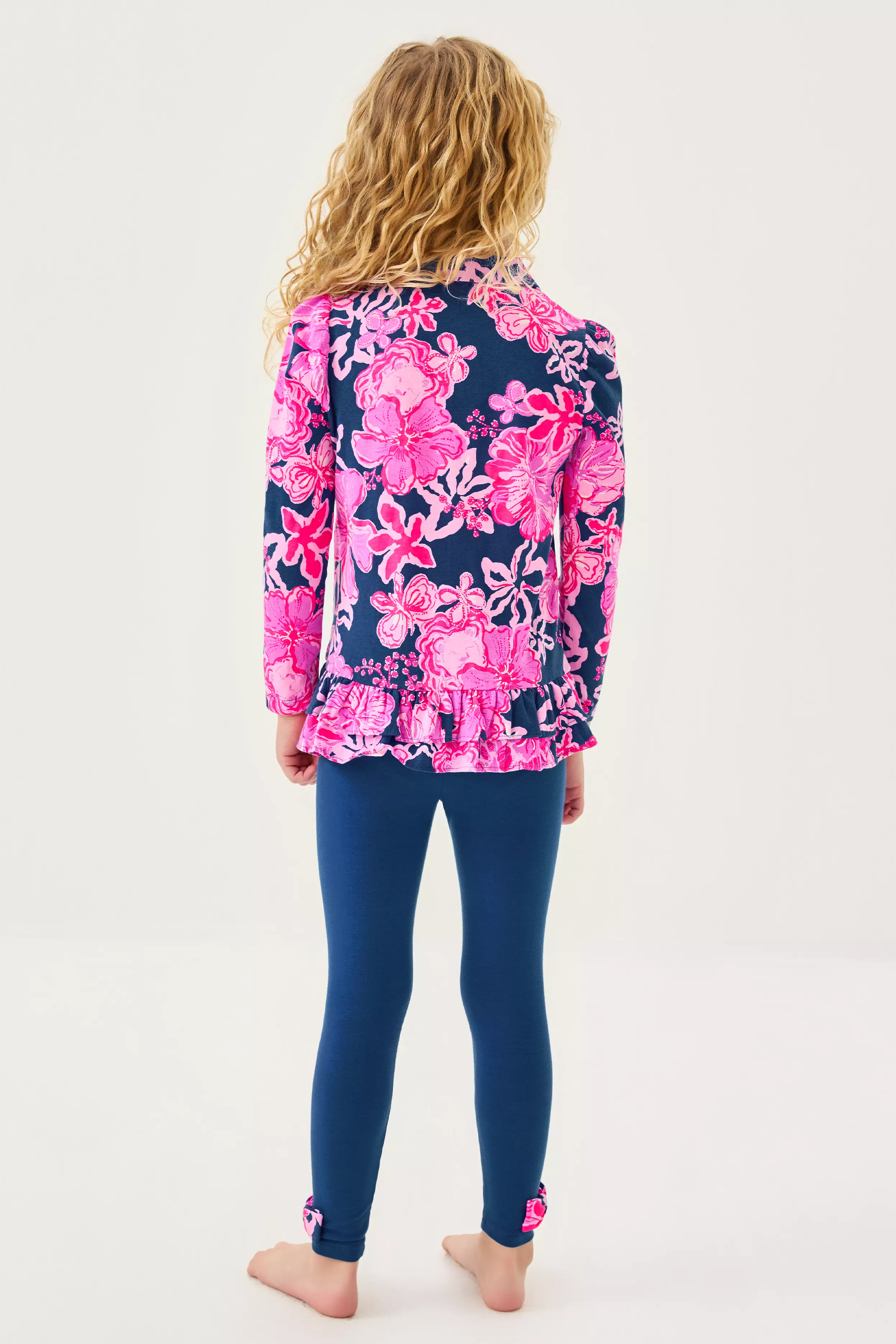 Easy fit, tunic polo top with long sleeves and buttons. Includes matching pull-on leggings with hem bows.