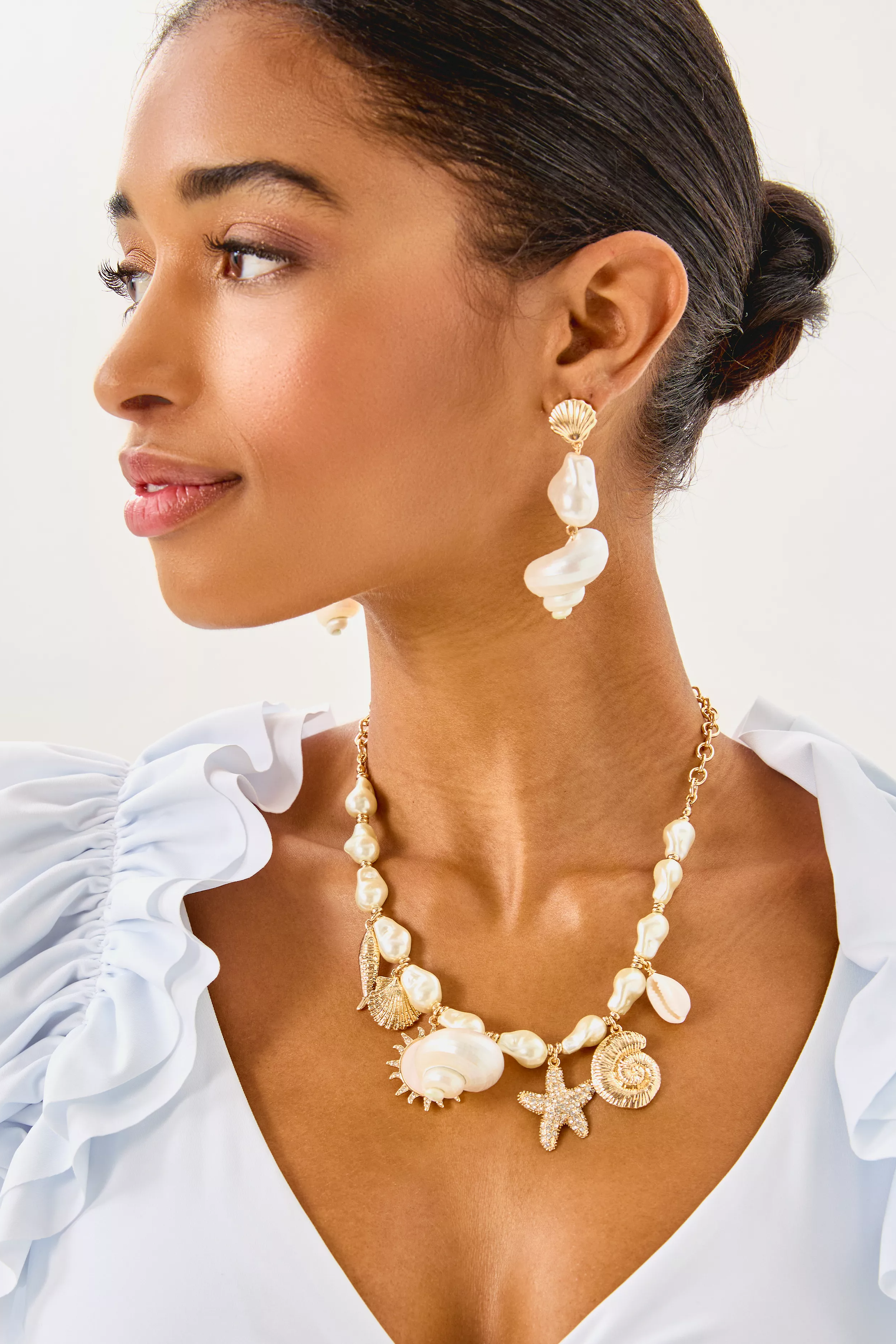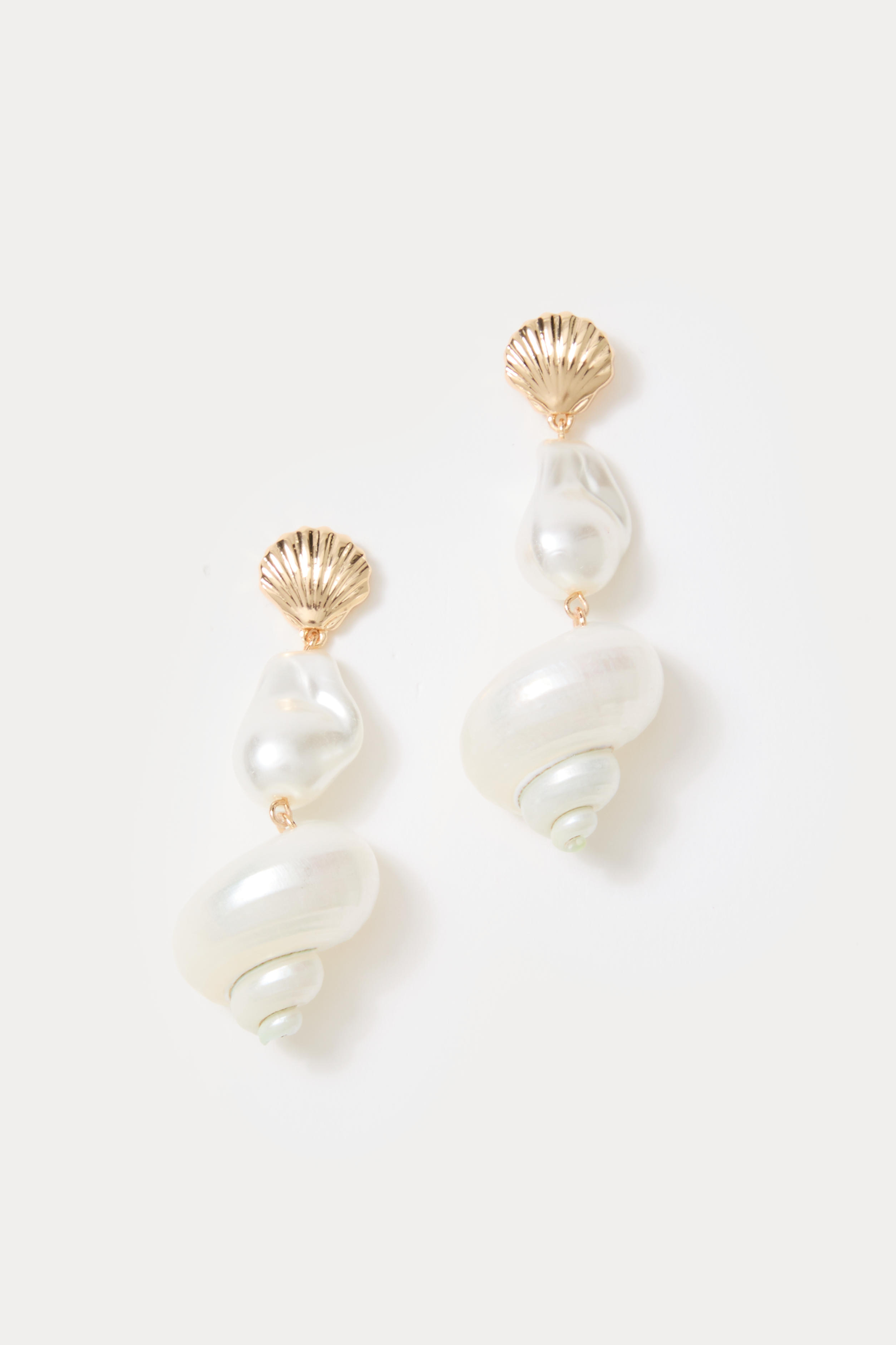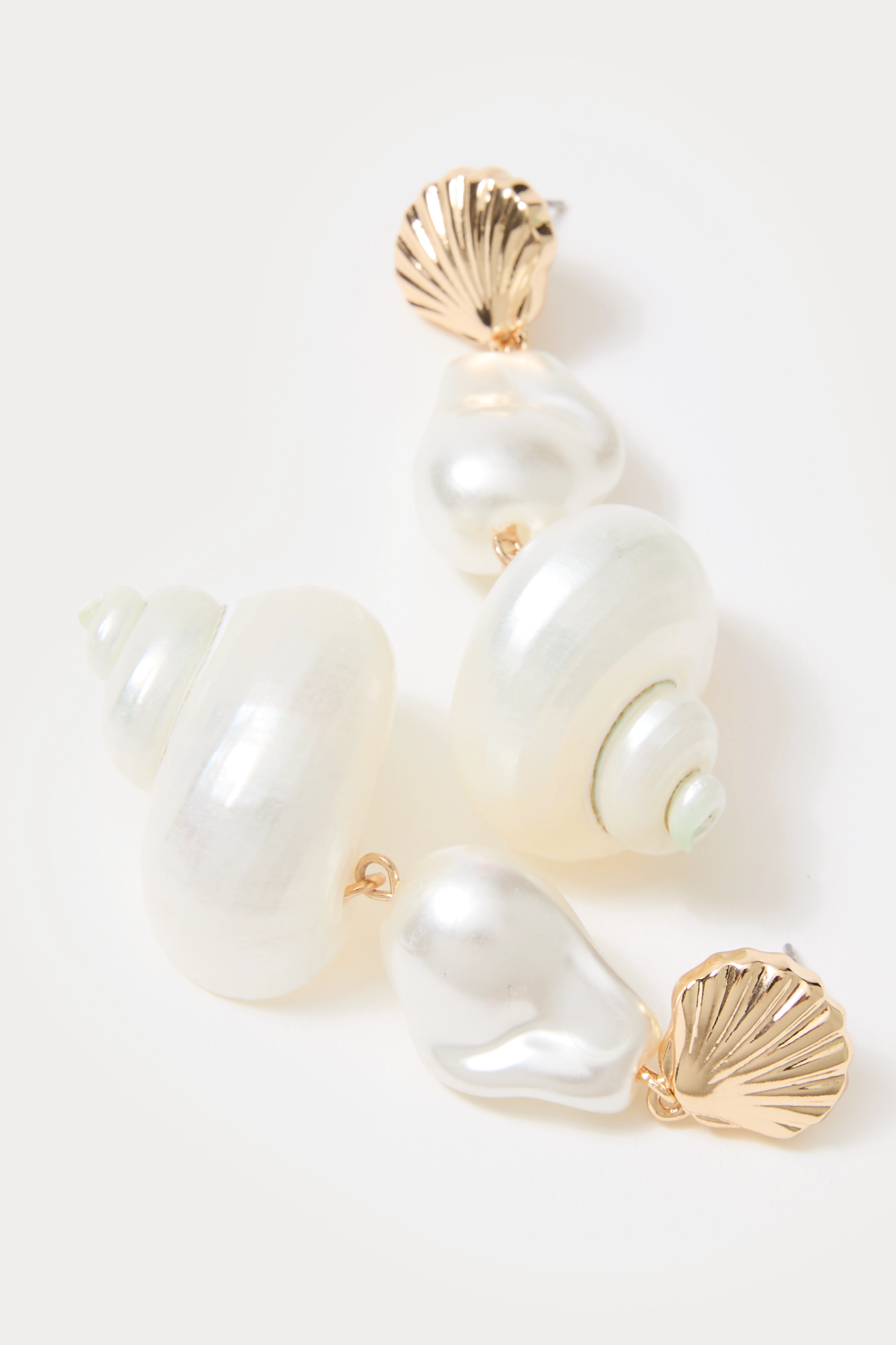 Shell and baroque pearl drop earrings with a gold metal sunshell topper.