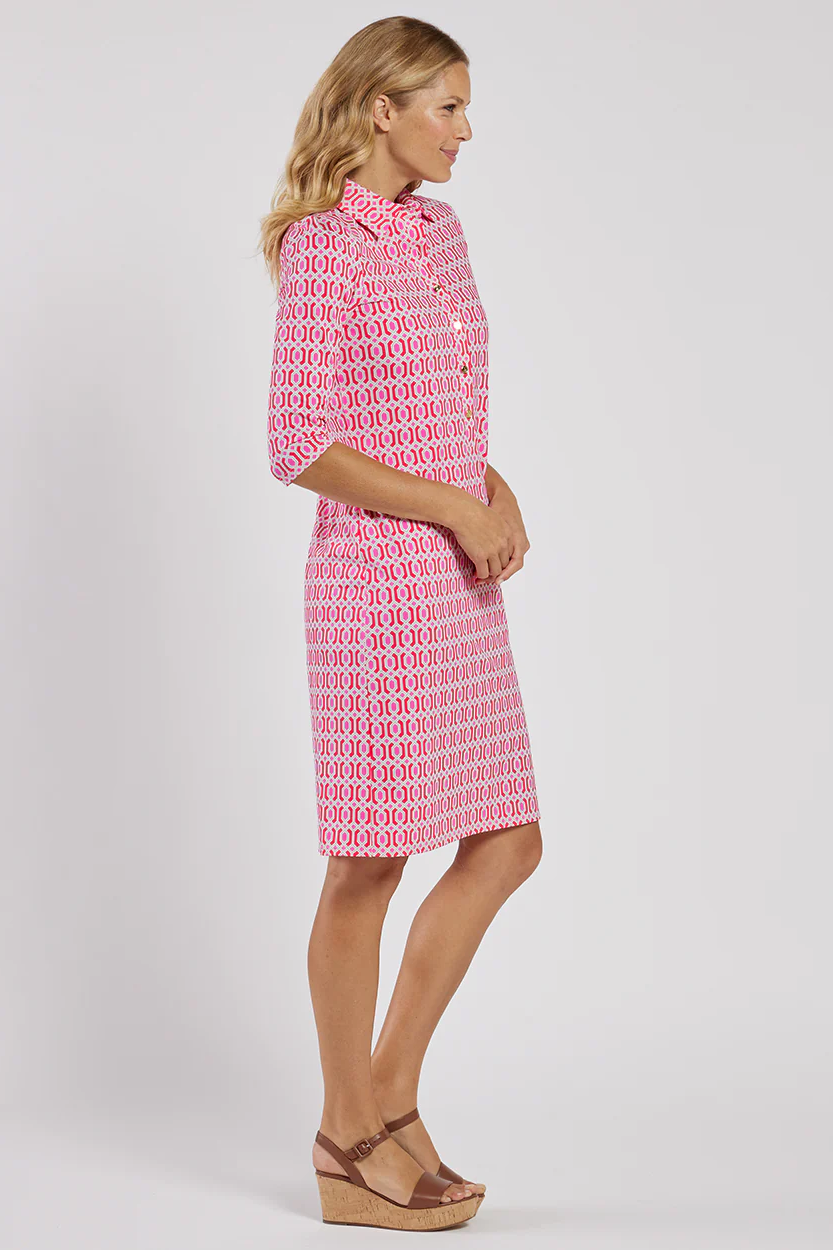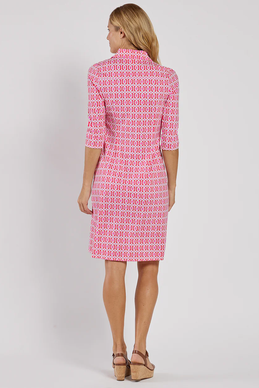 Susanna is a classic, polished shirt dress with ¾ sleeves and signature JC gold buttons. It's bound to become a staple in your wardrobe. It also has back darts which are used to fold excess fabric and accentuate the fit of the dress.