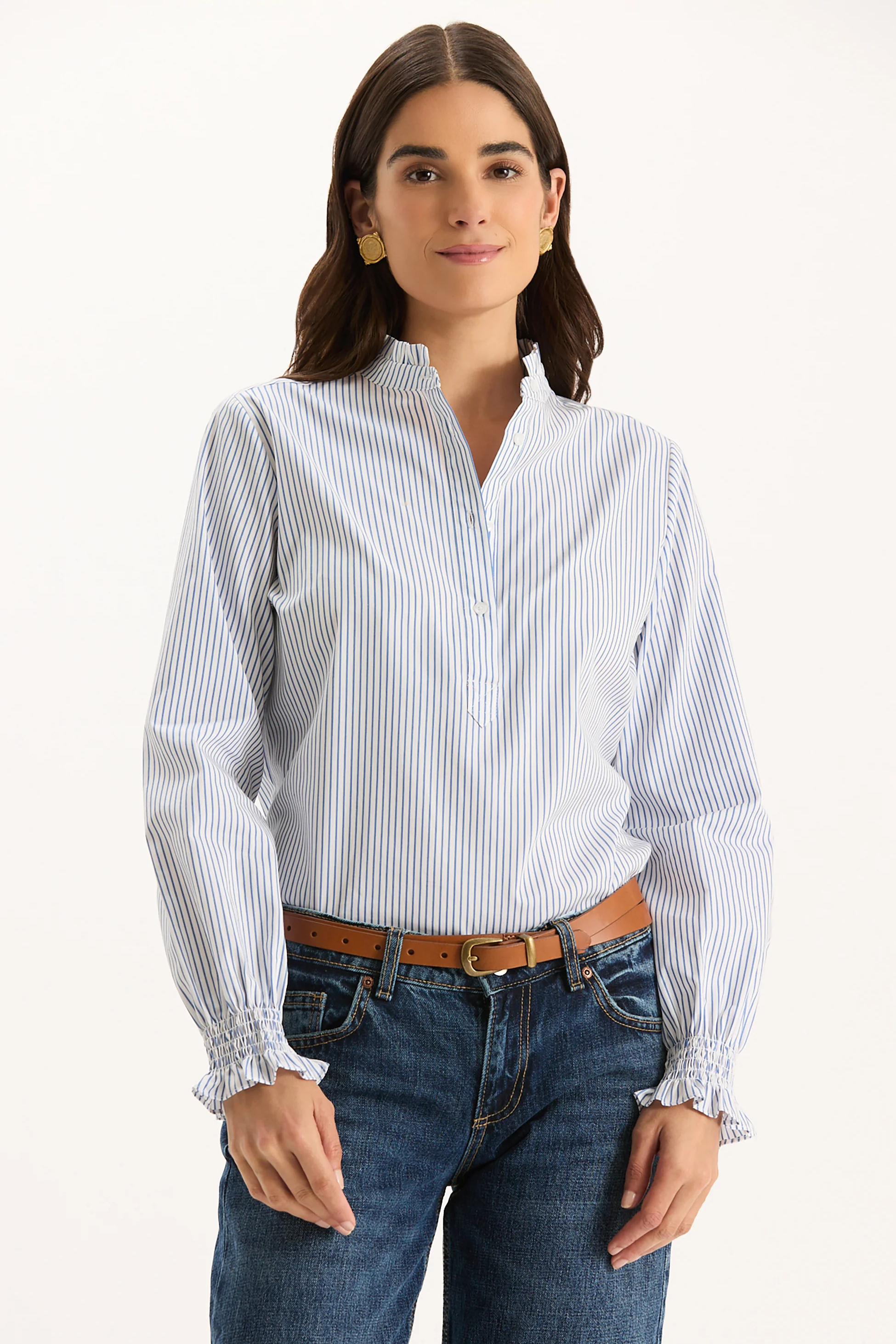 Gwen Pinstripe Ruffle Neck Shirt