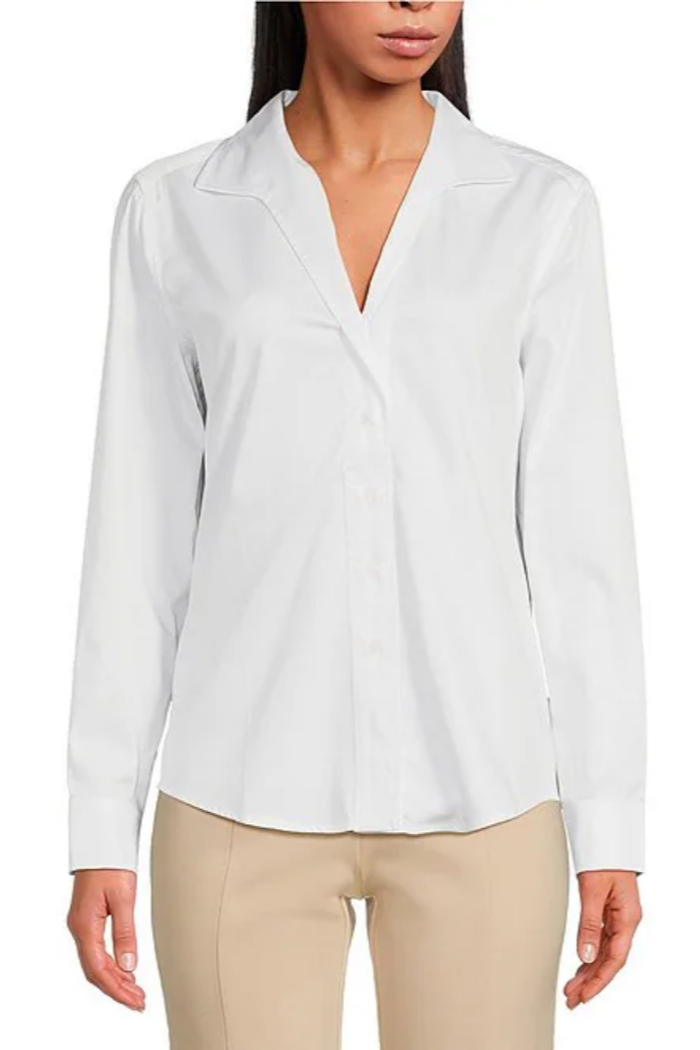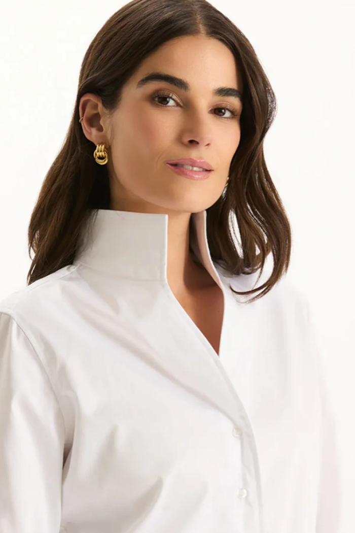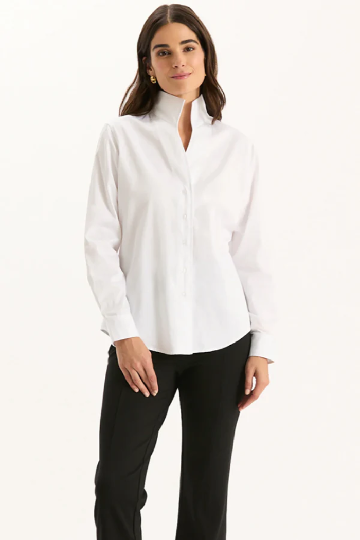 A seasonal staple and must-add piece to your wardrobe. This shirt features a sleek stand collar and tailored silhouette, making it the perfect base layer. Wear it solo for a crisp, clean look or under your favorite blazer or sweater for polished, all-season style.