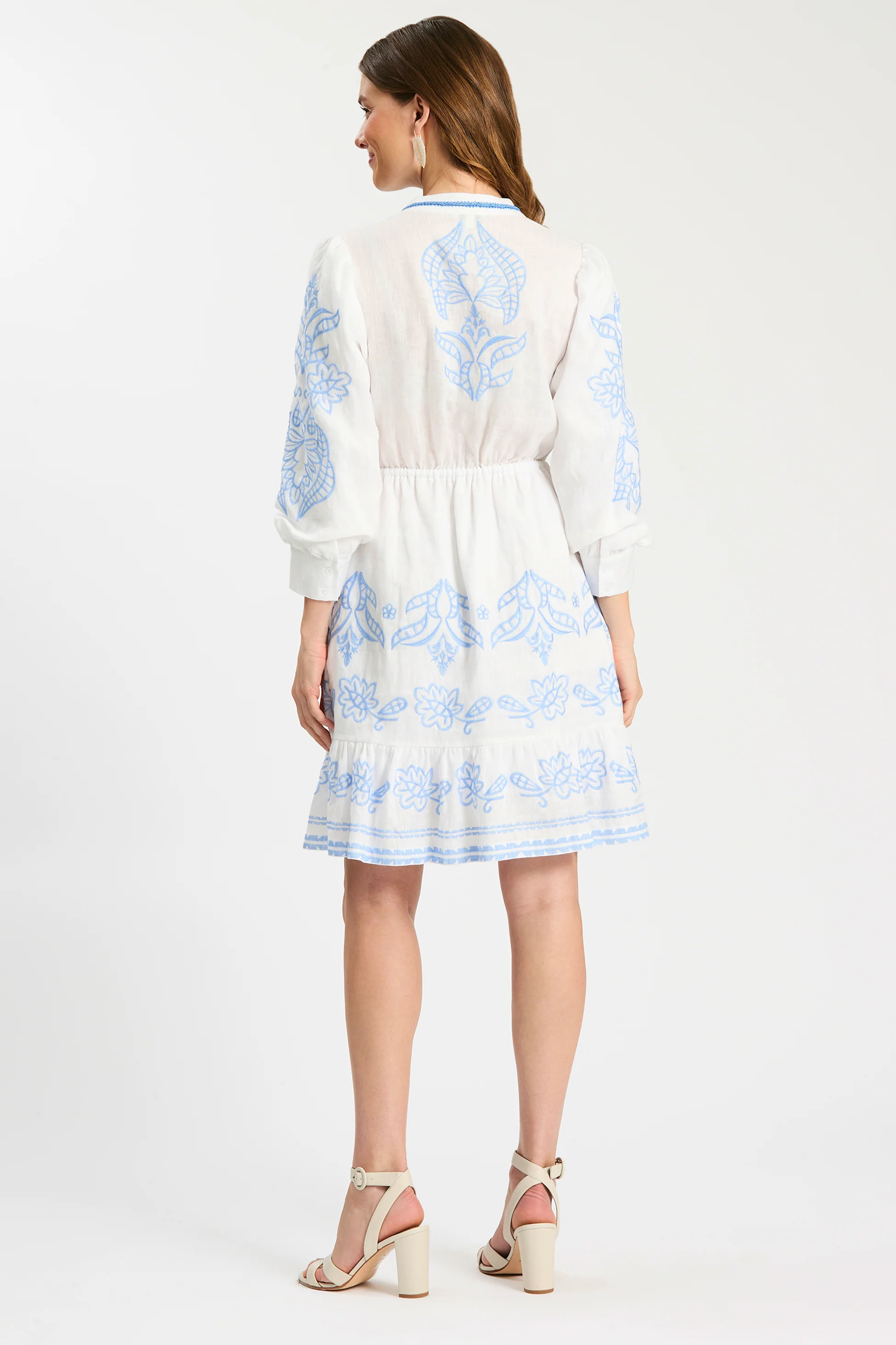 An effortlessly elevated warm-weather dress crafted in breathable linen, this dress features intricate embroidered detailing at the front, sleeves, and hem for a beautifully artisanal feel. Designed with a flattering tie-waist that defines the shape, this style offers an easy yet polished fit with graceful movement. It's the perfect piece for everything from beach days to dinner. Timeless, versatile, and endlessly wearable, it’s a dress you’ll reach for all season long.