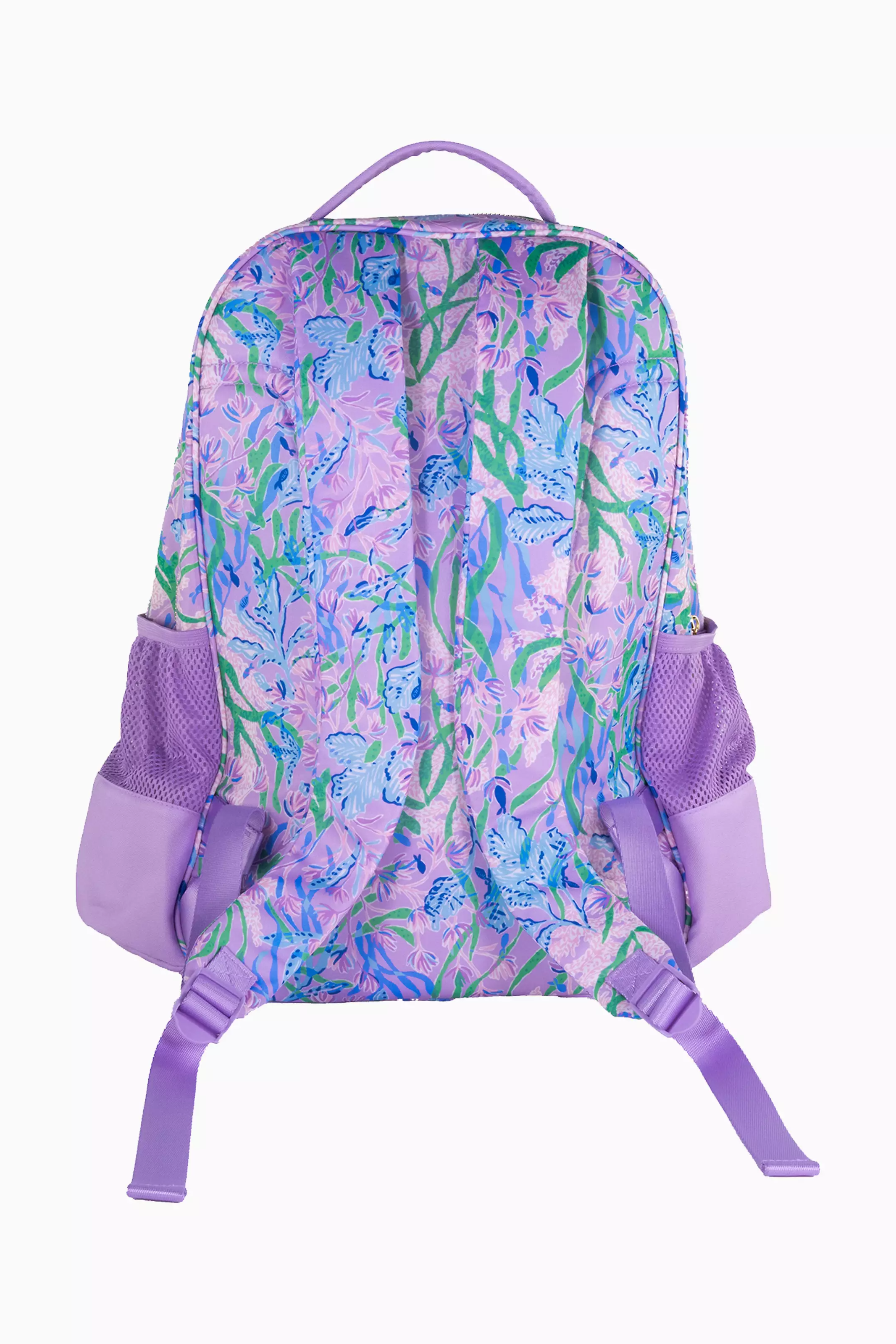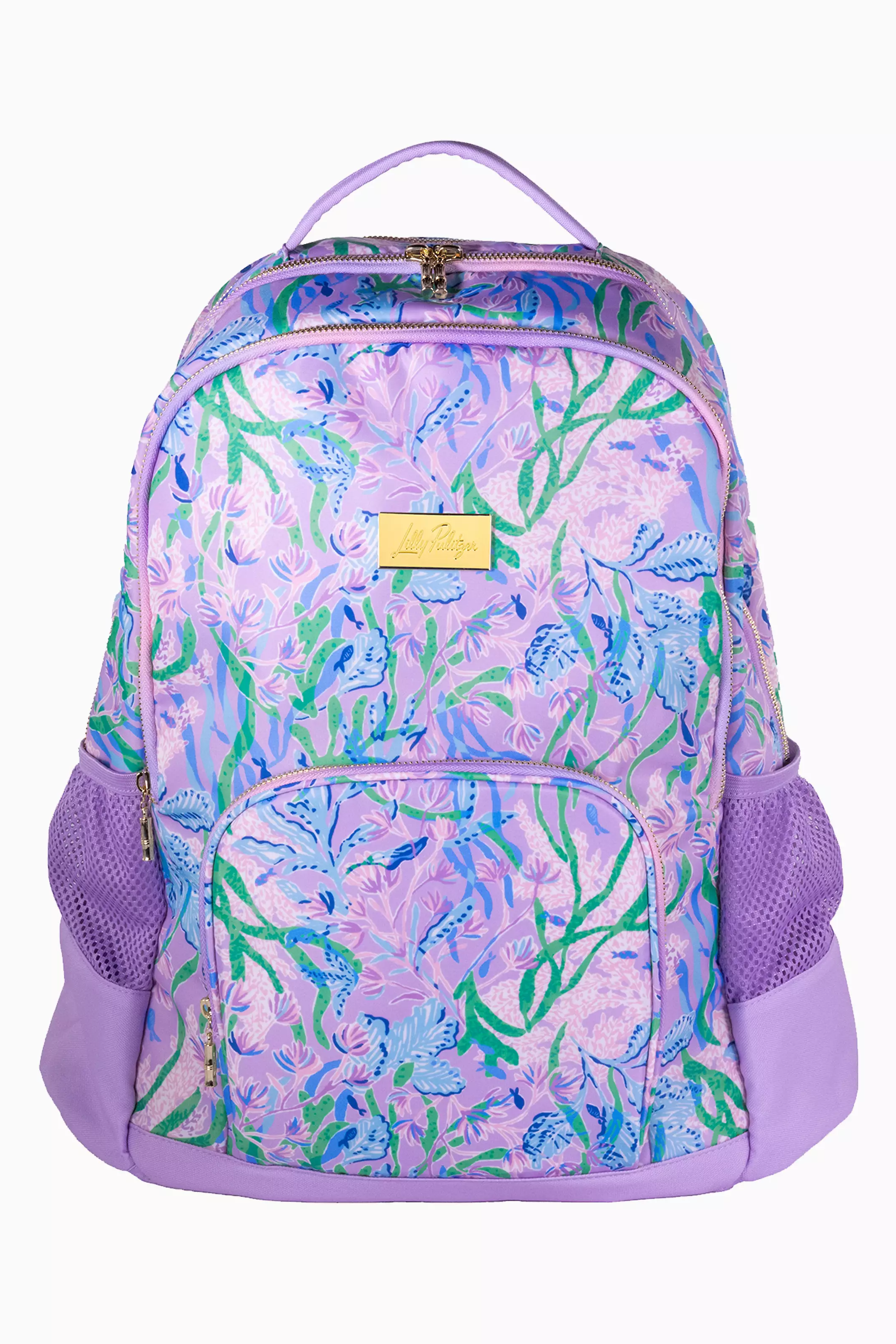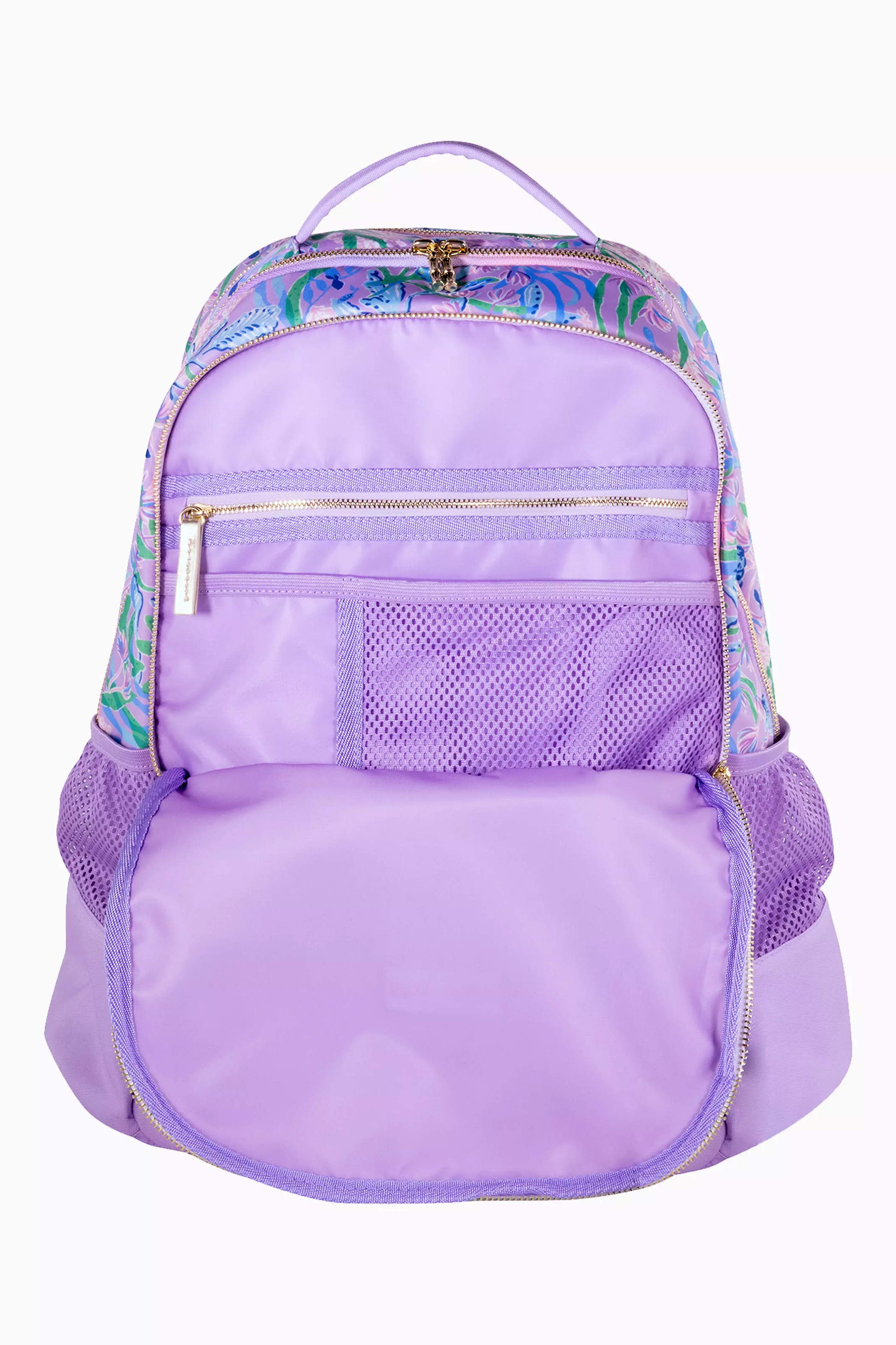 Backpack with adjustable straps, front zip pocket, side mesh pockets with elastic, gold bamboo zipper pulls, and gold logo plaque.