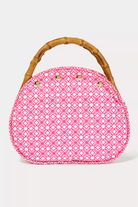 Bamboo handle bermuda bag with gold snaps and a wooden frame.