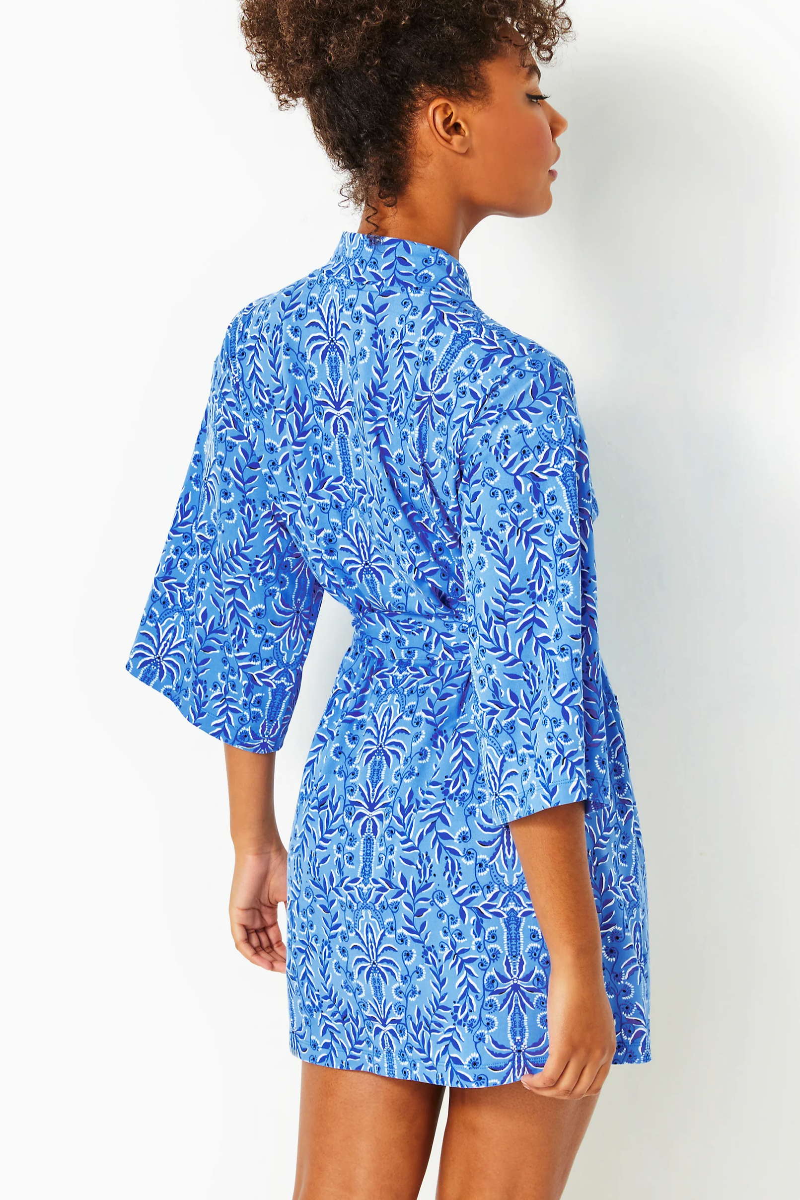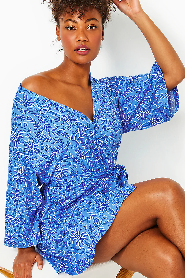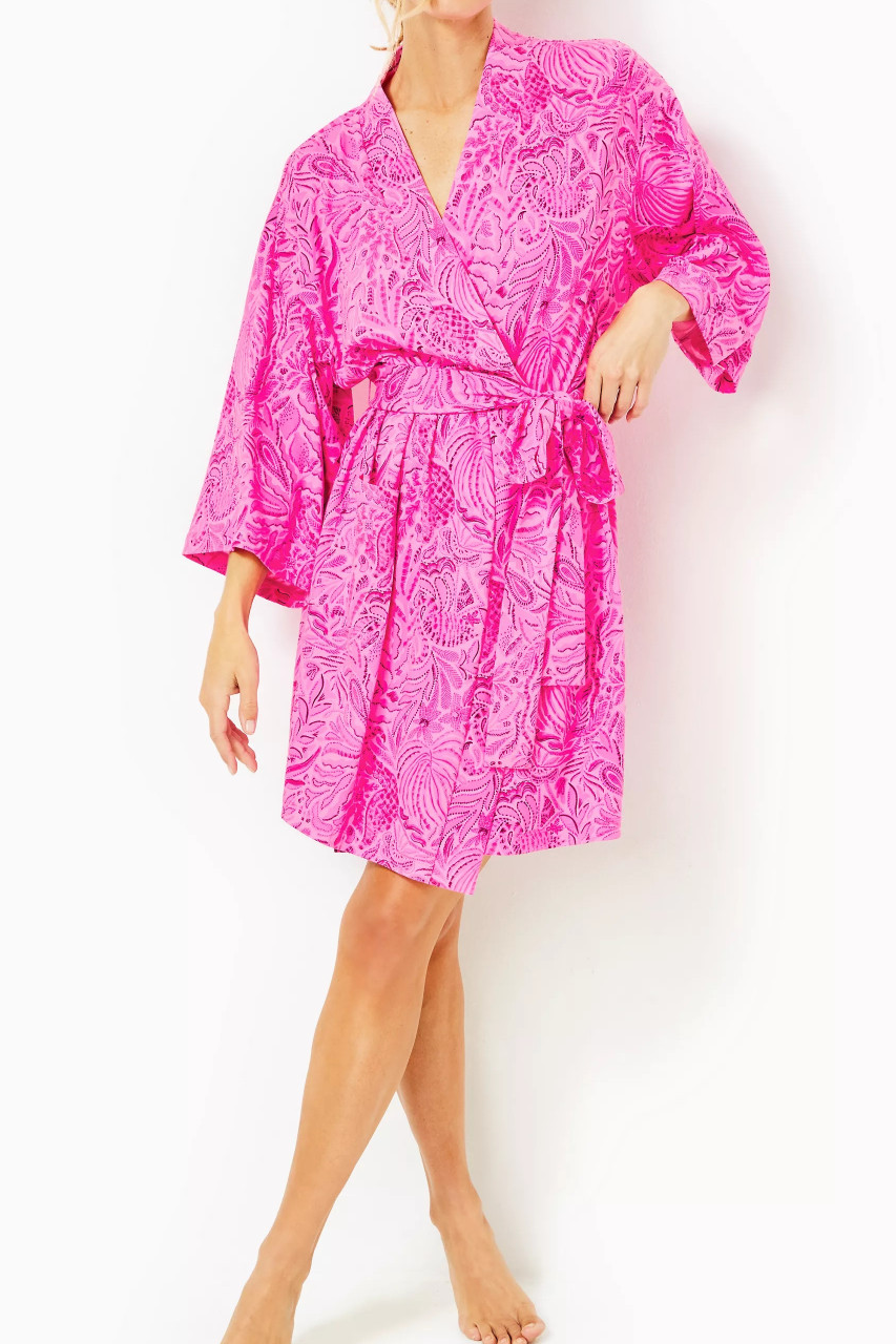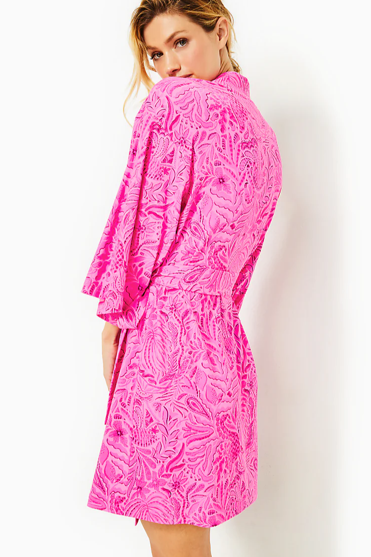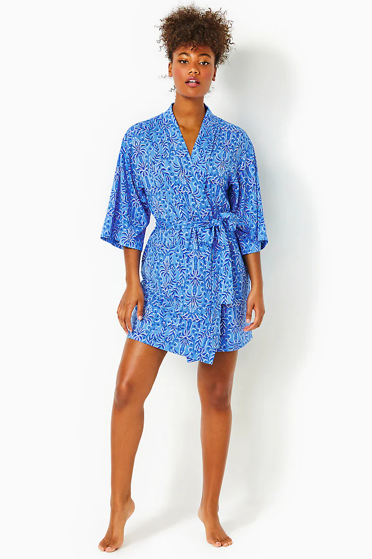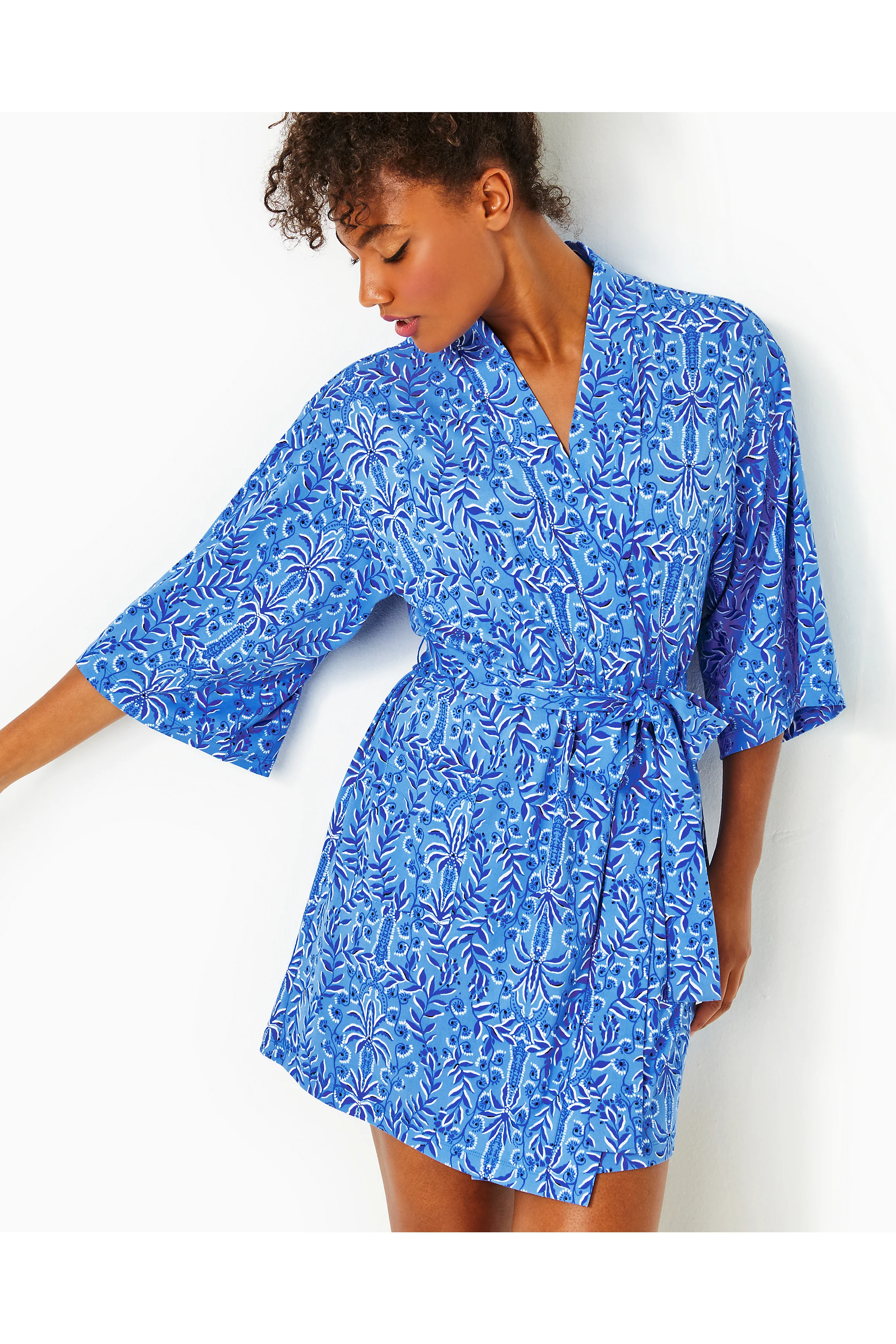 Above-the-knee robe with 3/4 length kimono sleeves, banded neckline, patch pocket, and a tie sash detail.