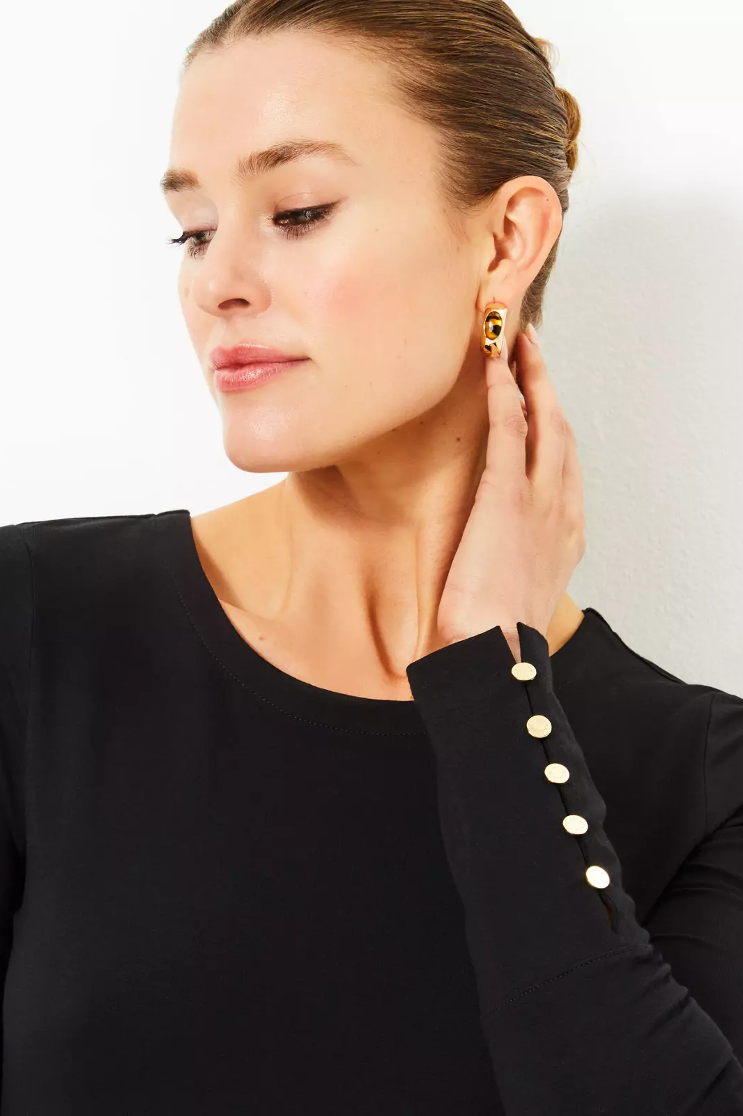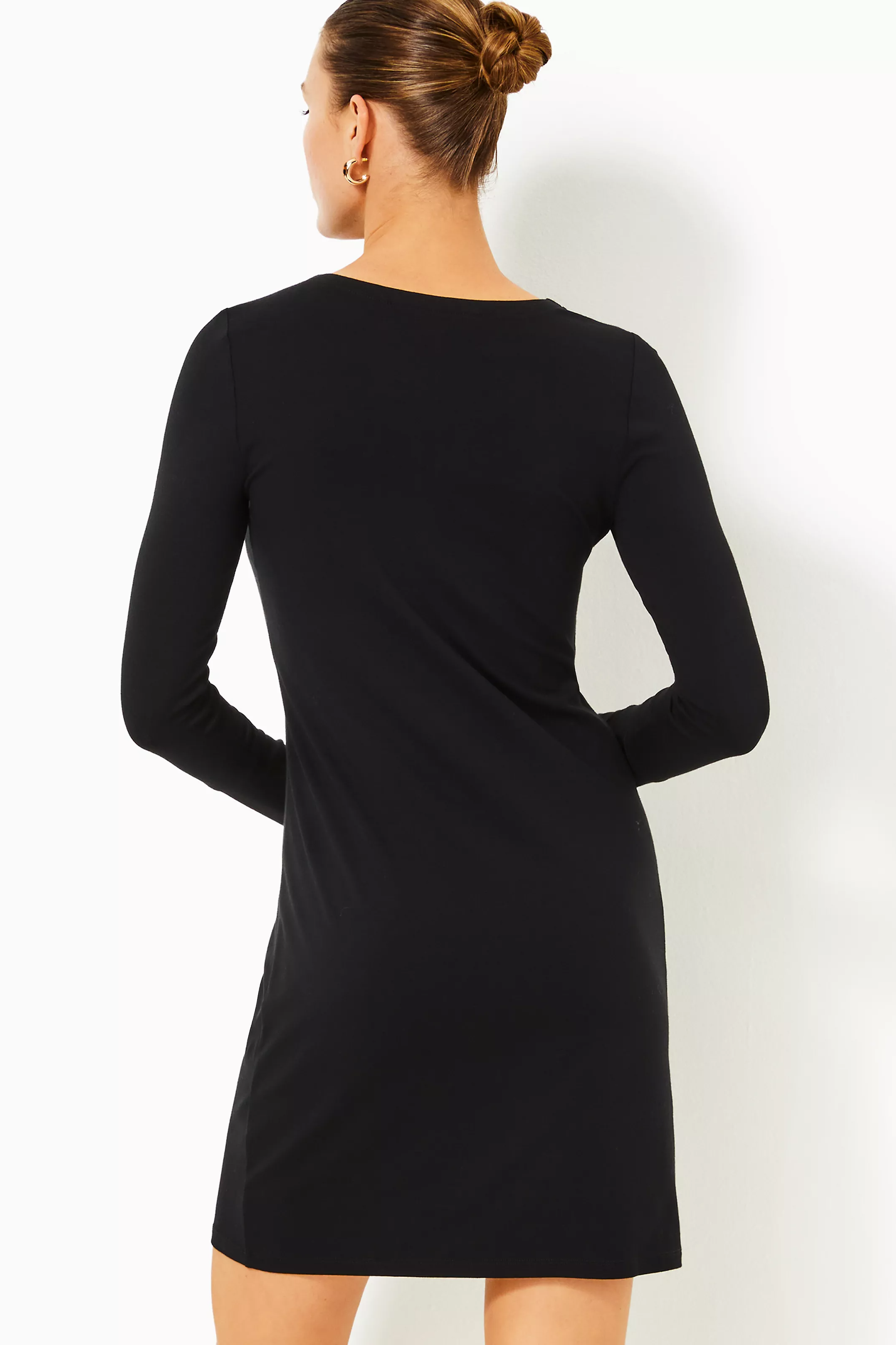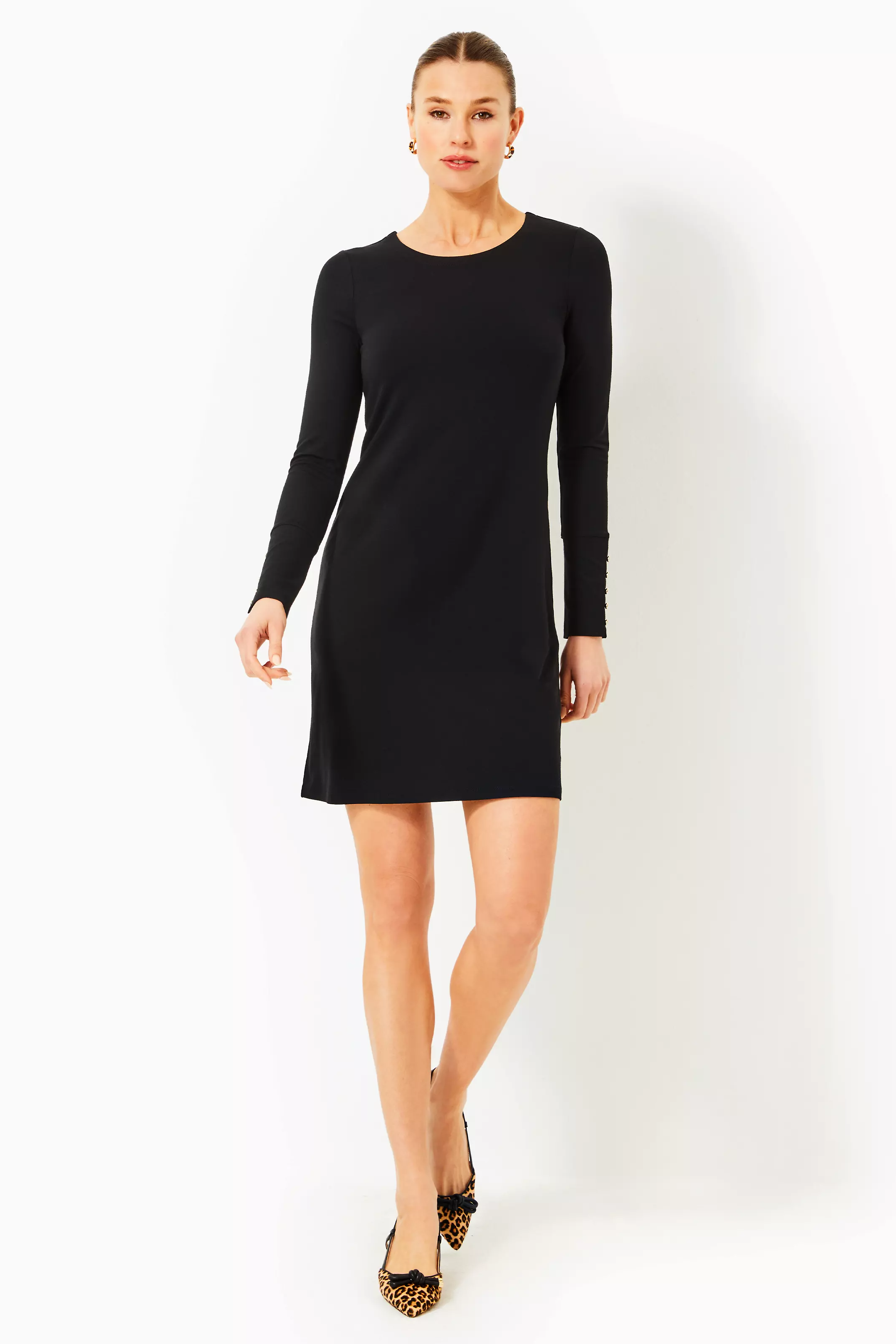 Straight fit dress with a crew neckline, long slim sleeves, and tall cuffs with gold buttons.