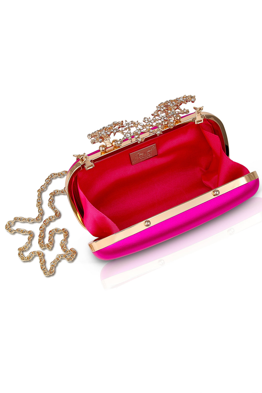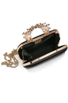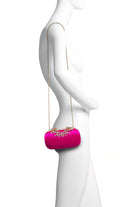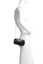 Adorned with shimmering stones, the dramatic lift clasp snap adds a touch of drama to this already eye-catching accessory. The gold-toned hardware only adds to its opulence, and the 22" drop removable chain ensures that you can carry it with ease and grace. But what truly sets this Minaudiere apart is its satin material, which exudes a lustrous sheen that catches the light with every movement.