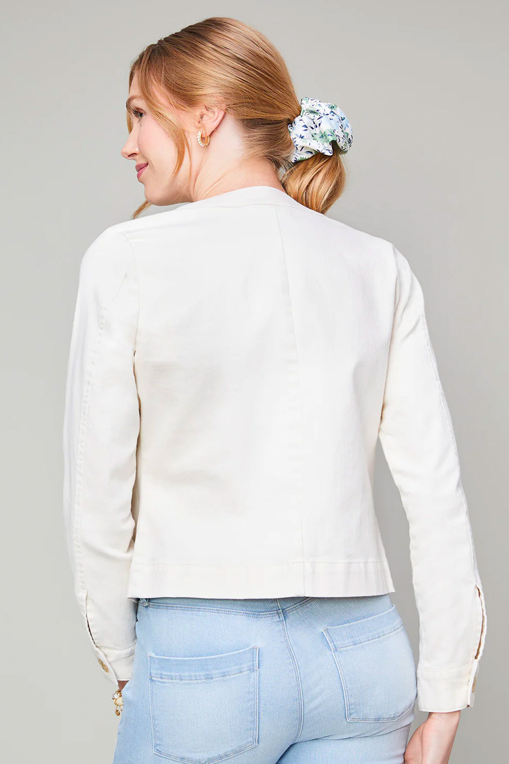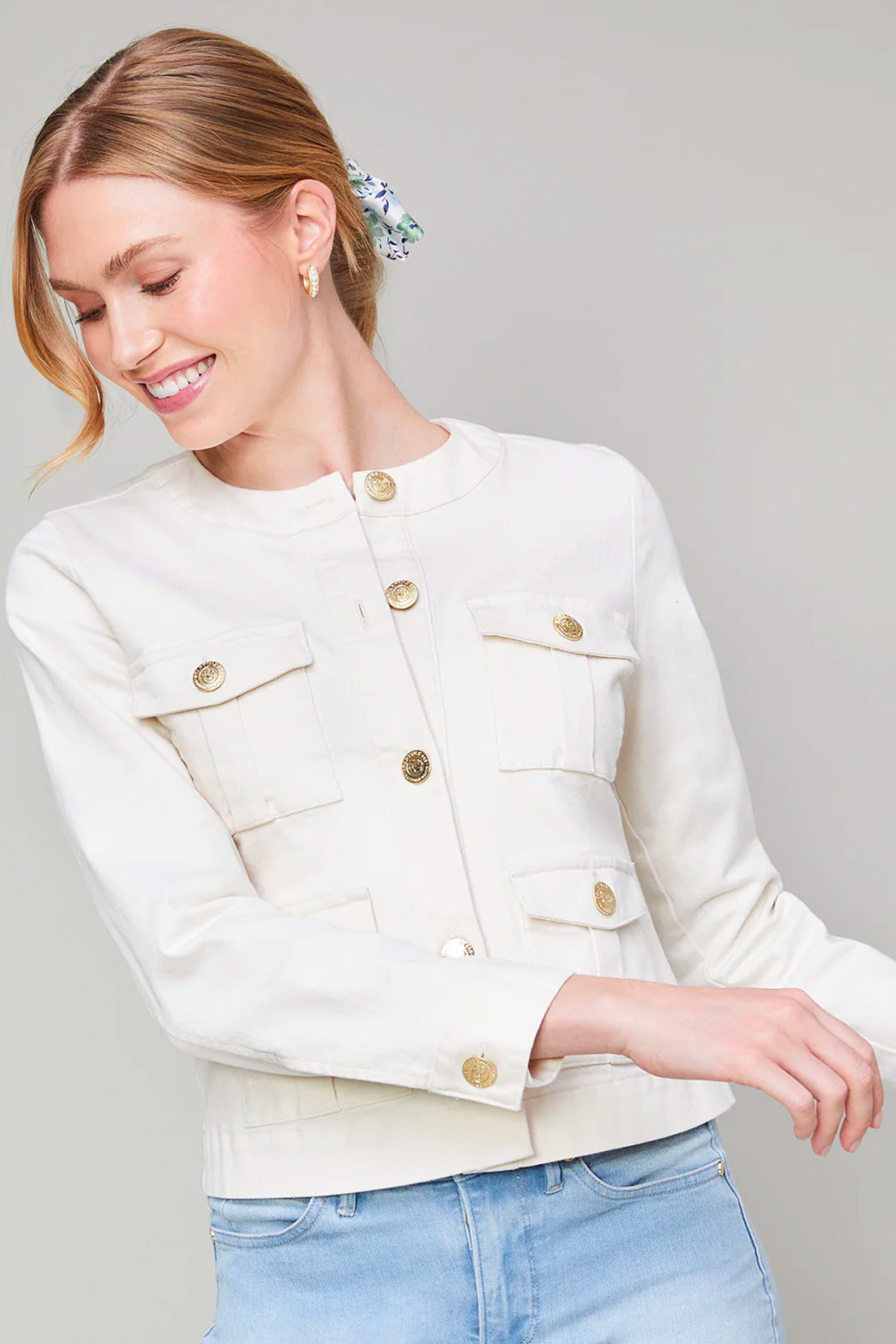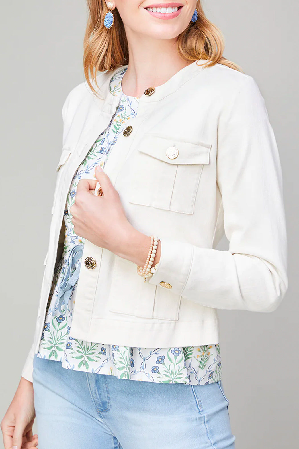 Wear our Kinsley Denim Jacket all year long. Front flap pockets and gold logo buttons give textured style and functionality to this stretch denim jacket that layers perfectly atop sheer or sleeveless tops. Wear across collections as this neutral women’s off-white denim jacket playfully pairs with bold prints and keeps your look balanced.