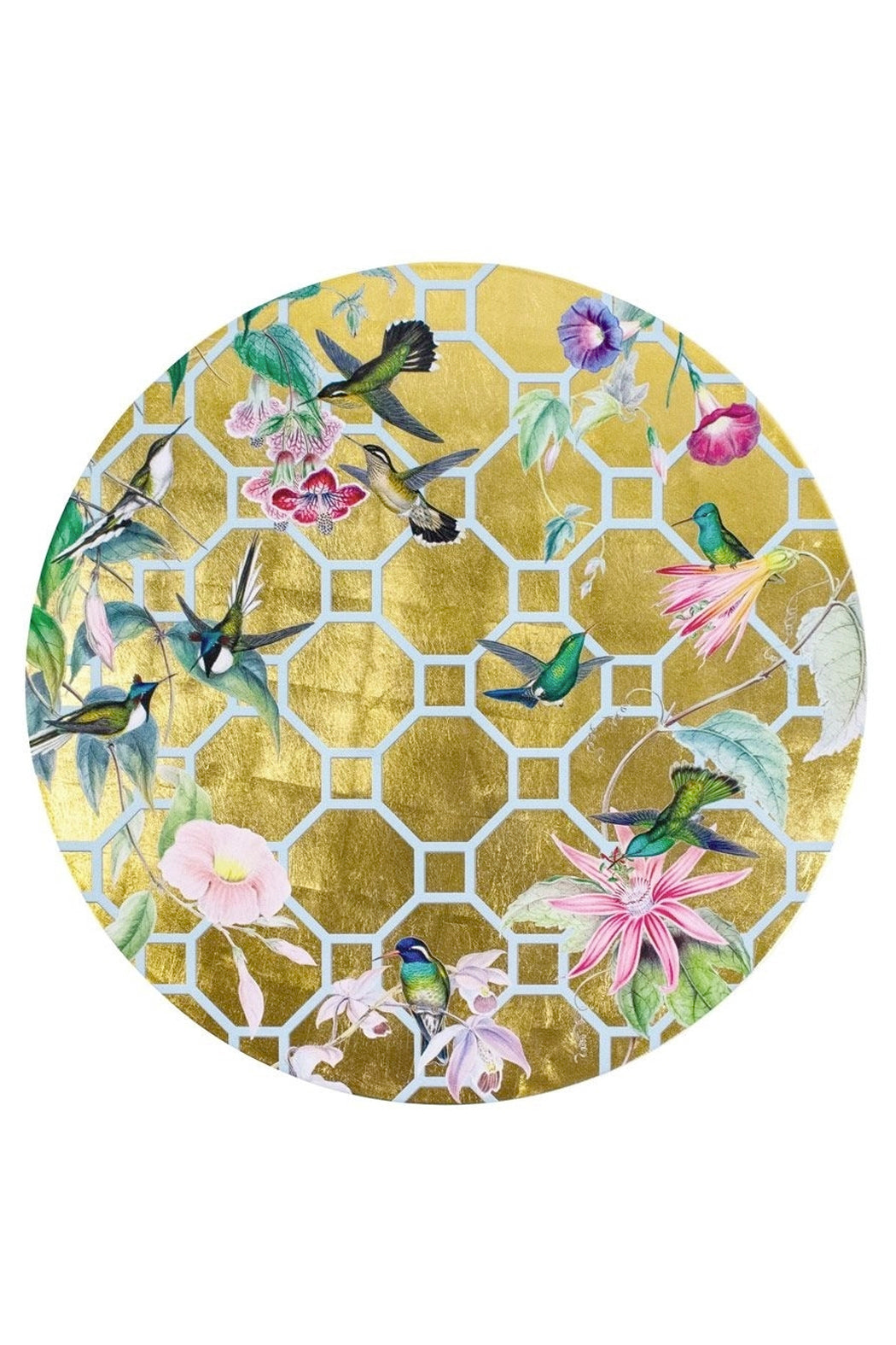 In this Design: Hummingbird Trellis - A collection of painted hummingbirds, flowers, and vines intertwine in a graphic hexagonal trellis. 15" Diameter. #15111LQPMRND.