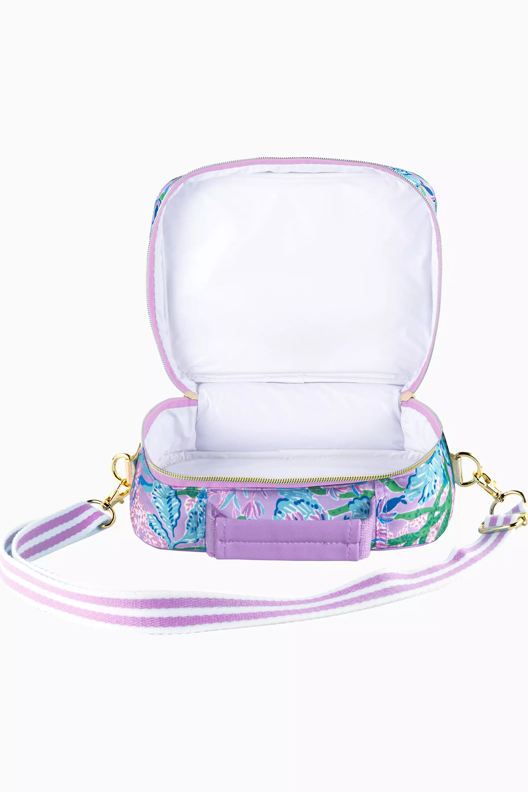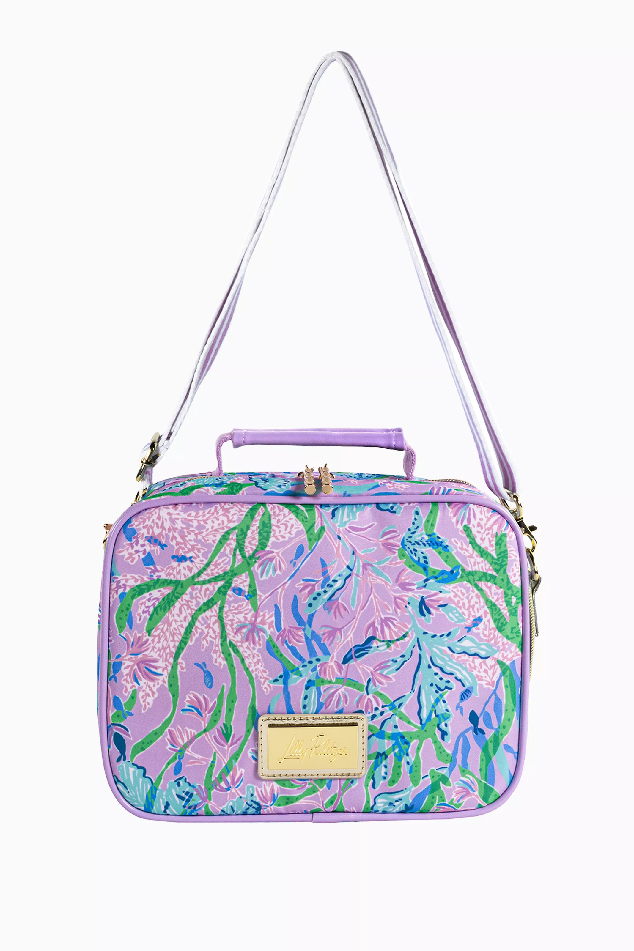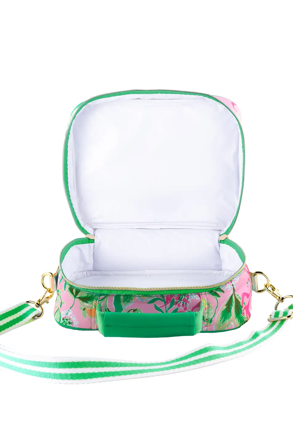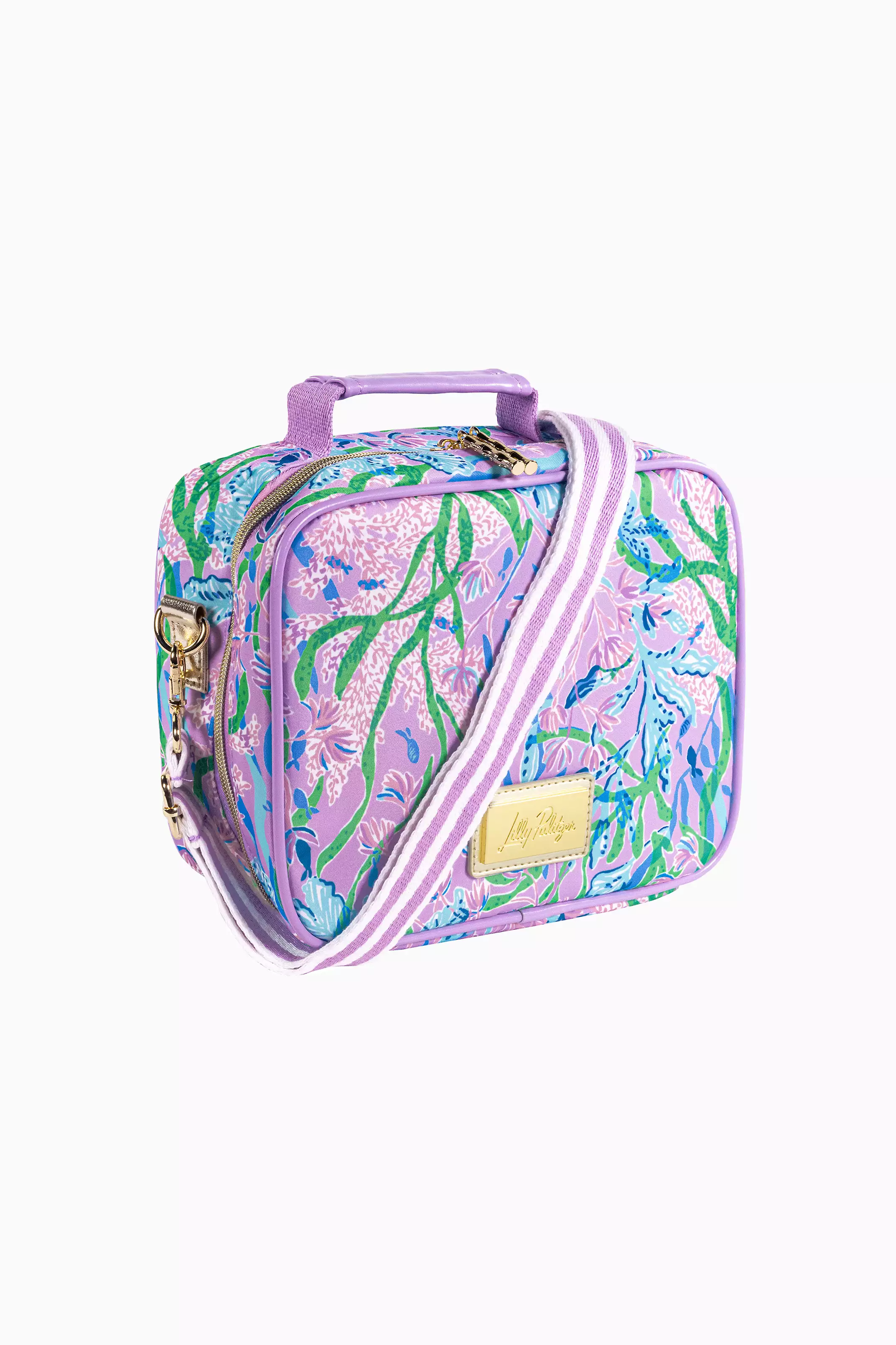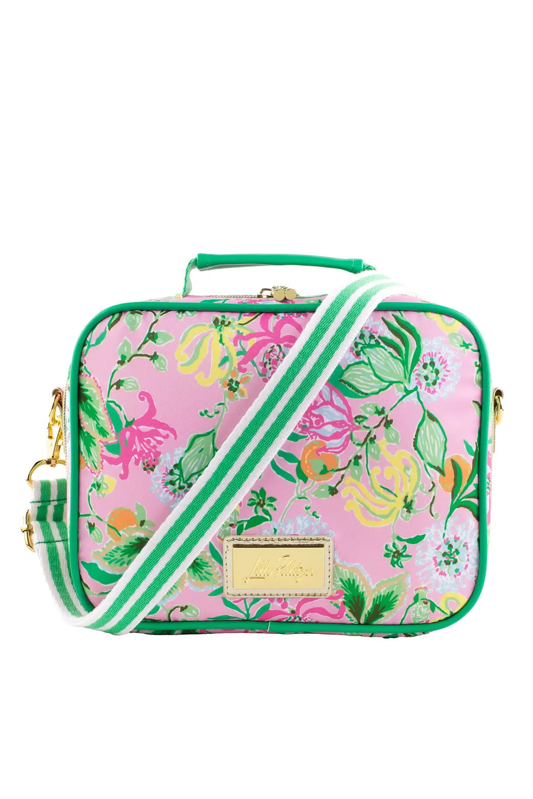 Who's ready for a delightful picnic lunch? Say goodbye to fast food and bring your favorite treats with you in style with Lilly. This lunch bag is designed with convenience in mind, featuring an adjustable strap for easy carrying. It is made of a durable weather woven material and has an insulated interior that is easy to clean. The bag also includes faux leather details, gold hardware, and a logo plaque, adding a touch of elegance. With its vibrant pattern and versatile carrying strap it can also be used as a travel case.