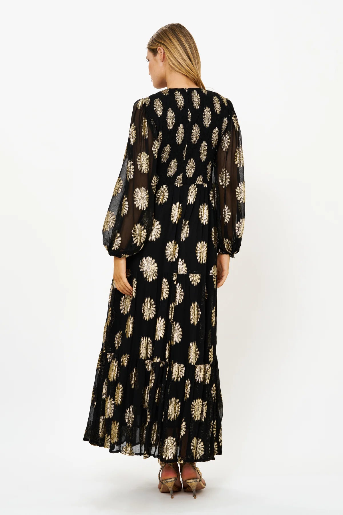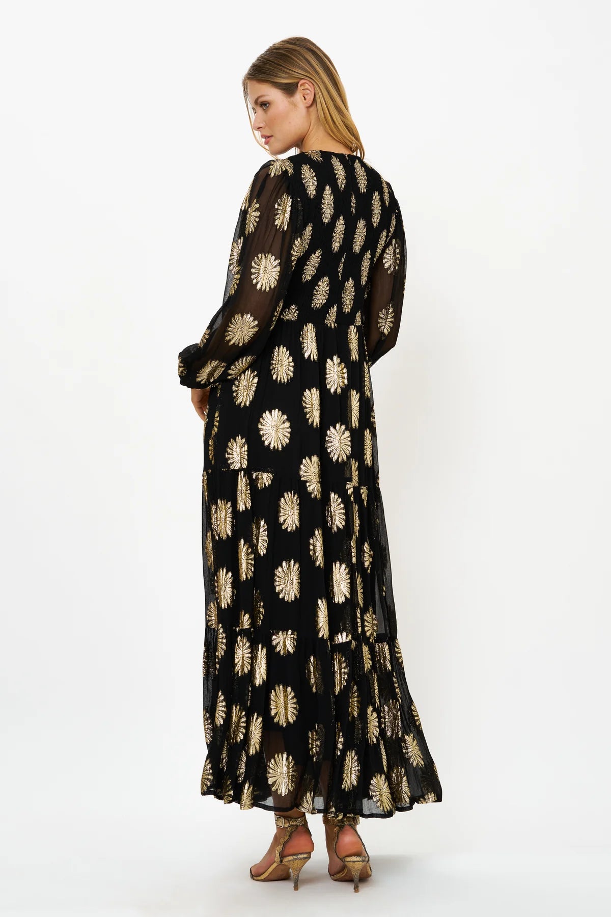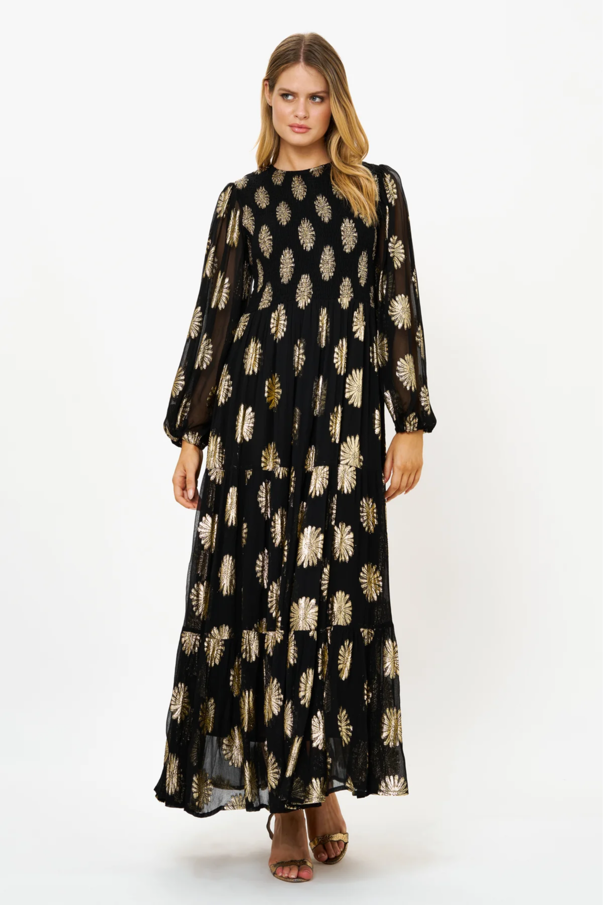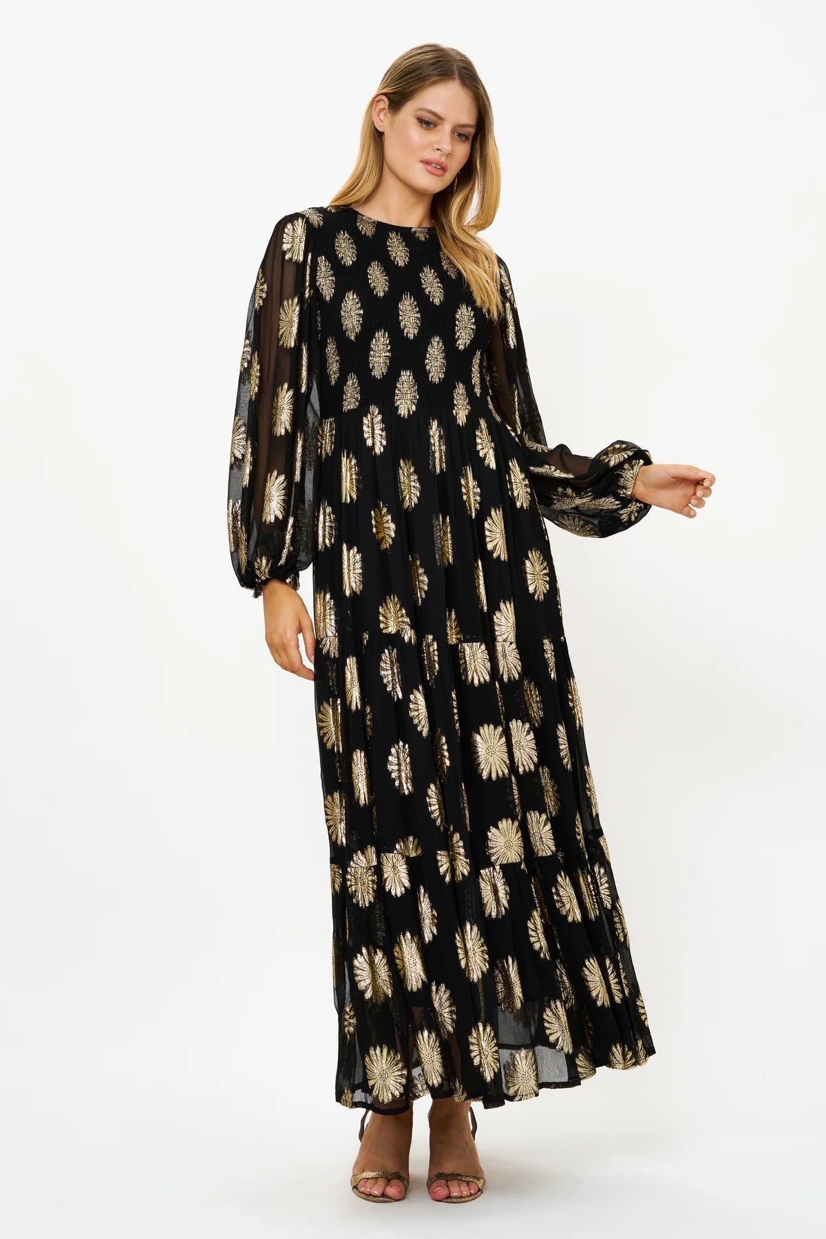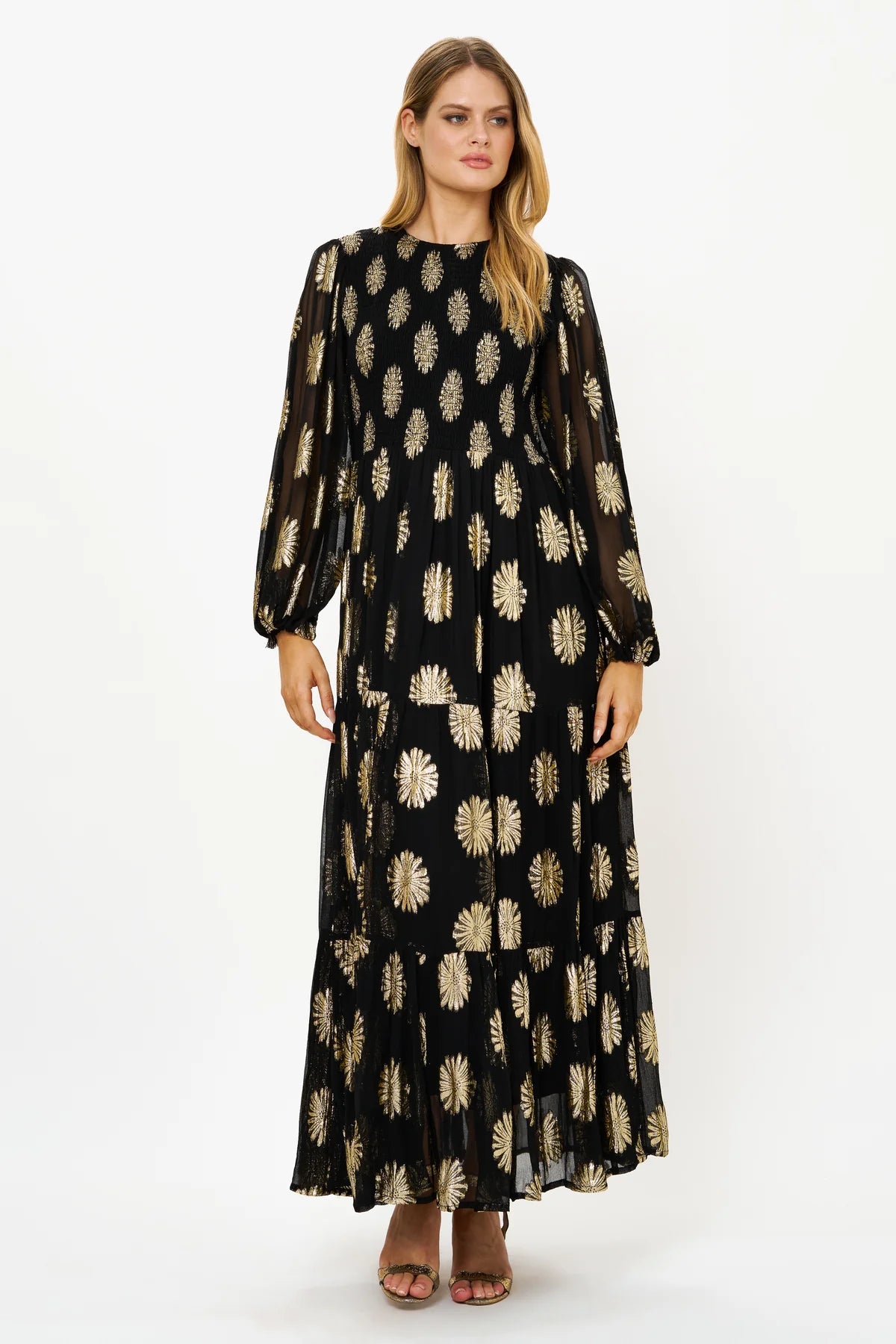 A modern take on an iconic retro silhouette. Top to bottom jacquard gold florals on delicate georgette fabric make this Smocked Top Maxi Dress a show-stopping piece at every party.